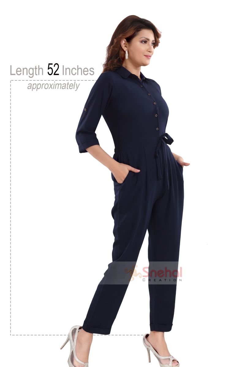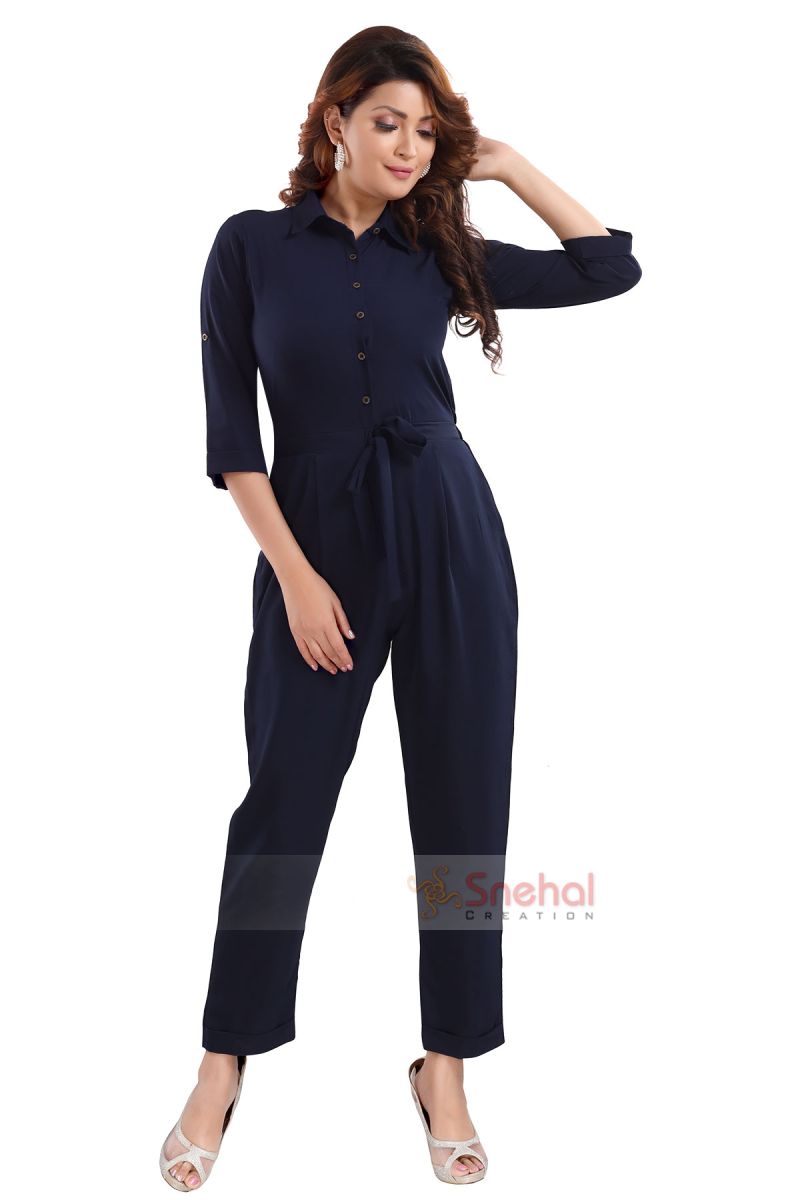 Finding a sophisticated outfit for important meetings? Get your hands on this elegant shirt collar front open solid blue color jumpsuit solely designed and sold by Snehal Creation. It is a full knee-length collared jumpsuit with stylish roll-up sleeves. It is plain and solid blue thus will look very chic with golden dainty jewelry or statement earrings. It is made from the finest and softest quality of faux crepe so it is very comfortable and can be easily worn throughout the day.