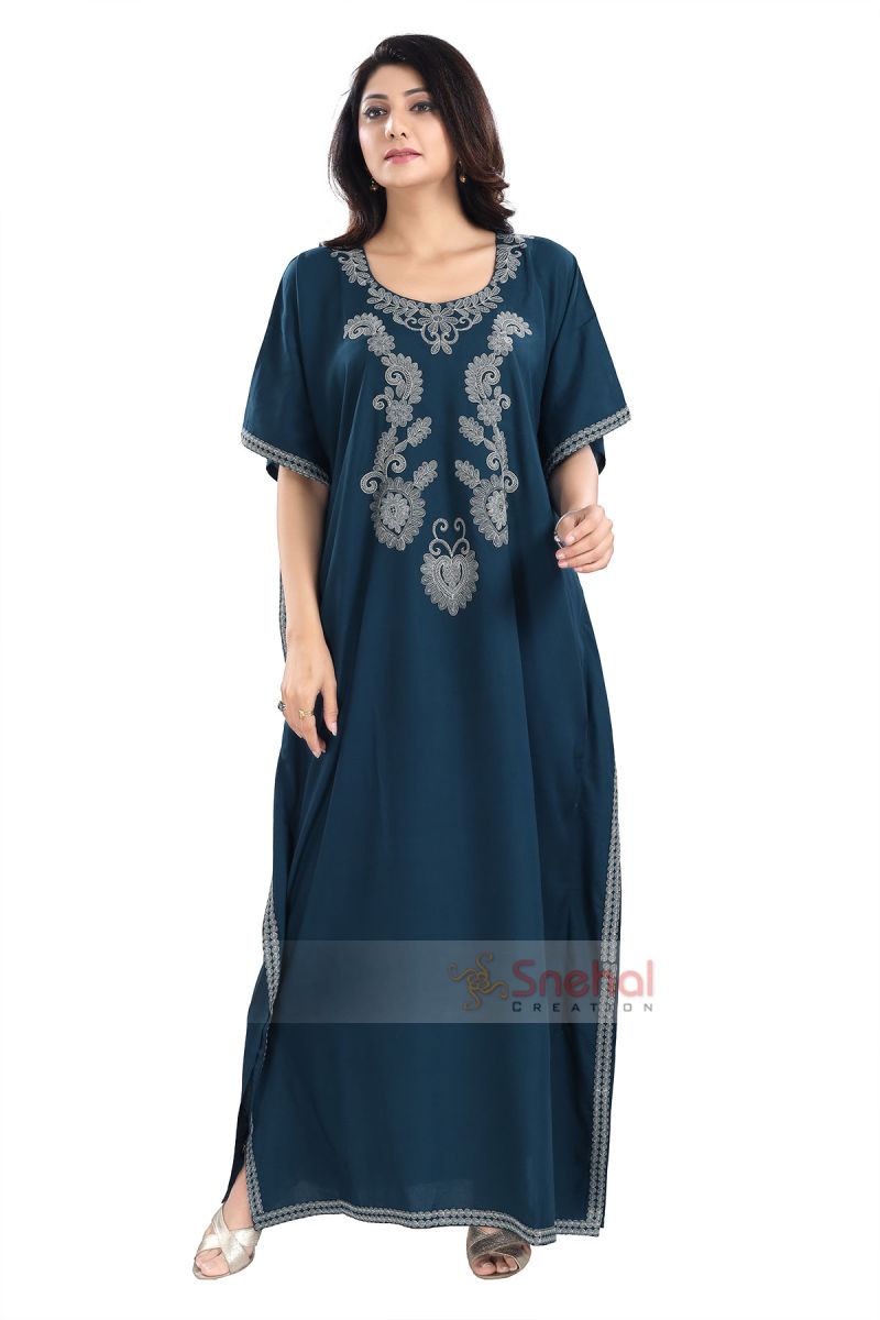 Turn heads with this Teal Blue long kaftan kimono maxi dress, designed for comfort and style. The rayon fabric keeps you cool, while the detailed embroidery offers a luxurious touch, perfect for the beach, lounging, or an evening party.