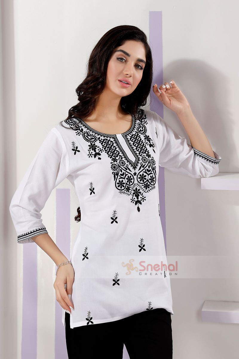 Introducing our elegant white rayon short kurti, a perfect blend of comfort and sophistication. This kurti features a graceful white hue, complemented by intricate black chikankari work, adding a touch of traditional charm. The 3/4 sleeves offer a contemporary look, making it suitable for both casual and semi-formal occasions. Crafted from soft rayon fabric, this kurti ensures all-day comfort and a flattering fit. Pair it with your favorite bottoms and accessories for a chic, effortless style. Ideal for any wardrobe, this kurti is a must-have for those who appreciate classic elegance with a modern twist.