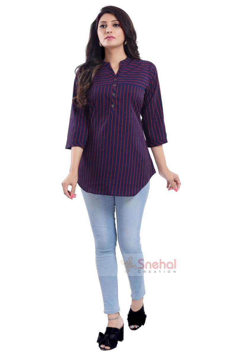 Stripes patterns can never go out of fashion. You still do not have one? Get your hands on this elementary blue and red striped polyester crepe short tunic top solely sold by Snehal Creations. It is a short length v-neck tunic with a button-down pattern in the middle which looks very appealing. The printed red vertical stripes accentuate the figure and make you look taller. It has got 3/4th sleeves to save your skin from suntan. The polyester crepe material fits perfectly and is very soft on the skin and fits like a dream.