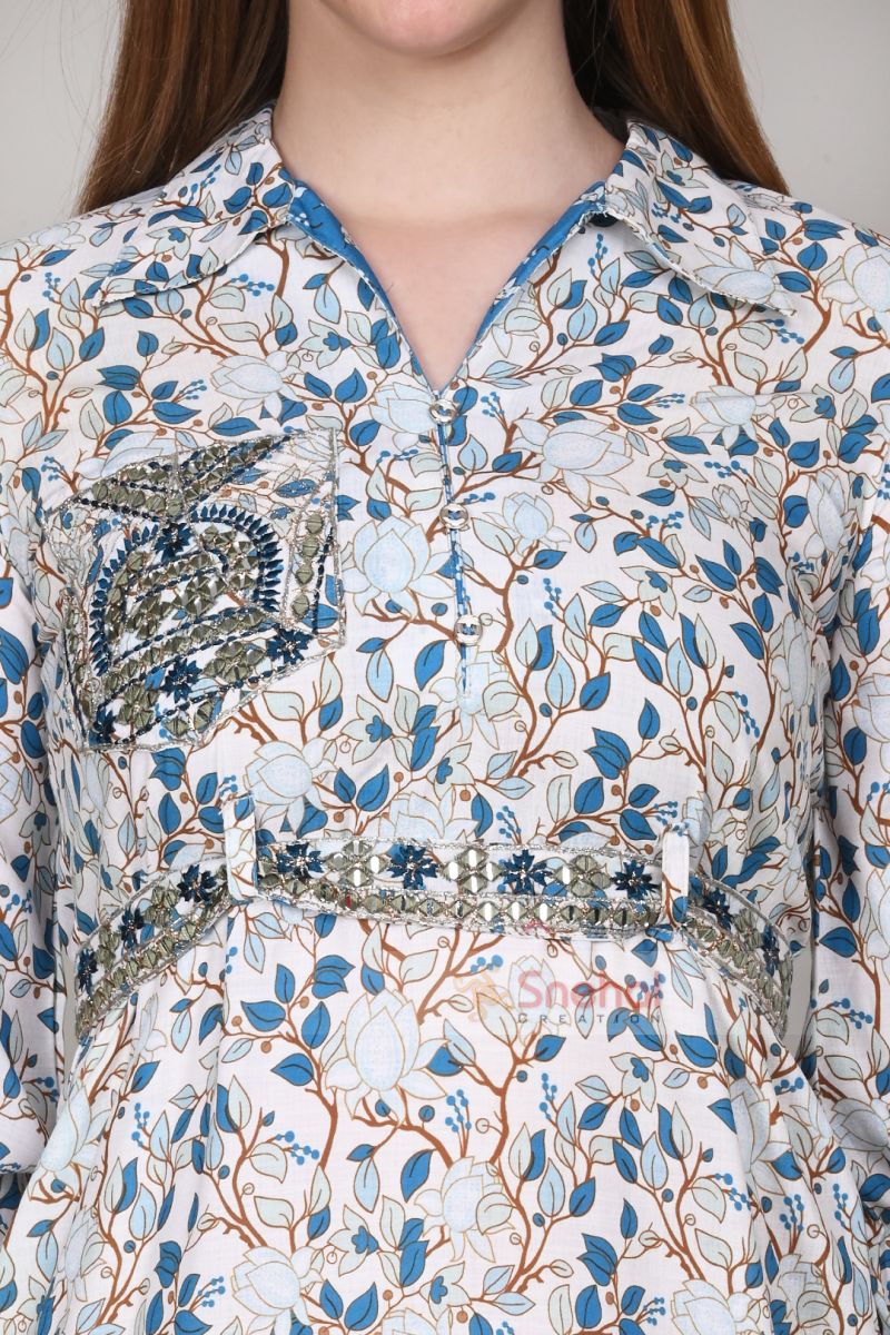 Discover timeless elegance with our Designer White Leaf Print Cotton Co-Ord Set with Mirror Embroidery on Pocket, Sleeves and Belt. Crafted from high-quality cotton, this ensemble embodies sophistication and comfort. The intricate leaf pattern adds a touch of nature-inspired charm, perfect for those who appreciate botanical motifs. This versatile set is ideal for both casual outings and special occasions, offering effortless style and grace. Elevate your wardrobe with this exquisite ensemble, designed to enhance your every look with its subtle yet striking appeal. Experience the epitome of chic simplicity with our Designer White Leaf Print Cotton Co-Ord Set.