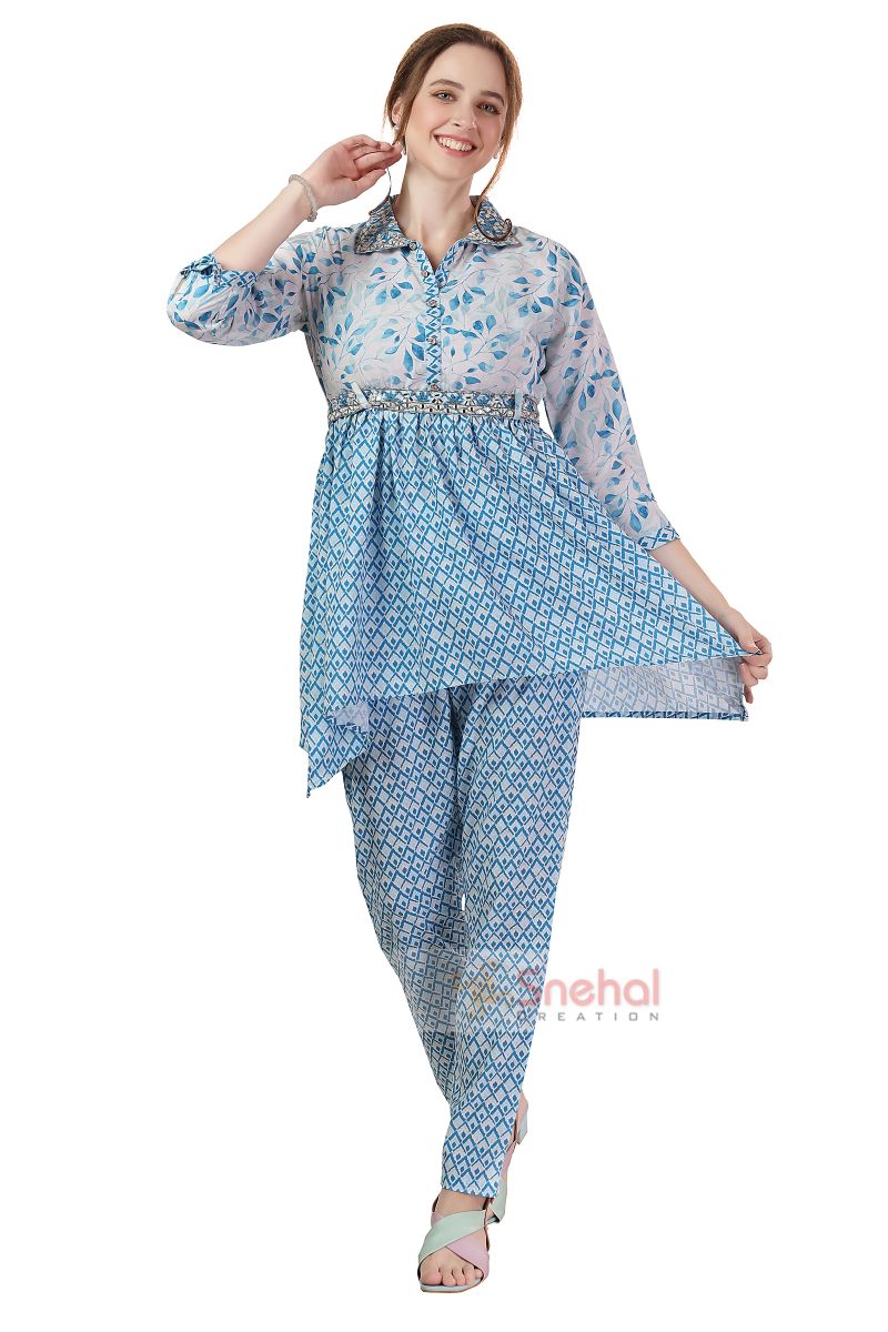 Ethnic Blue Leaf Print Cotton Co Ord Set With Belt and Shirt Collar.This Co-ord set comes with a embroidered belt separately and matching pant.