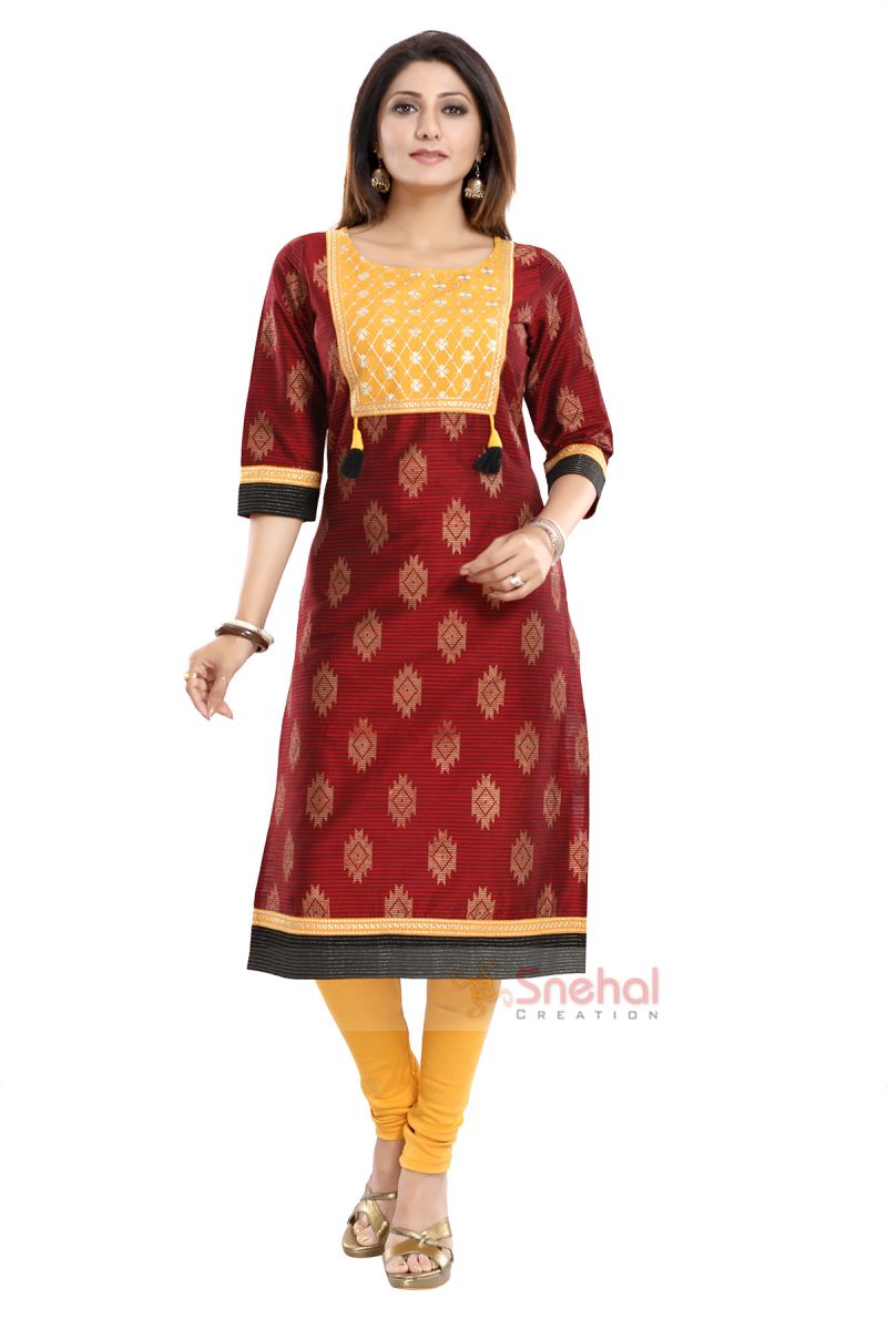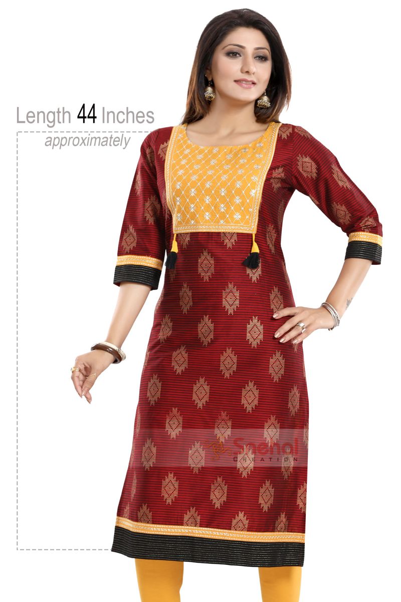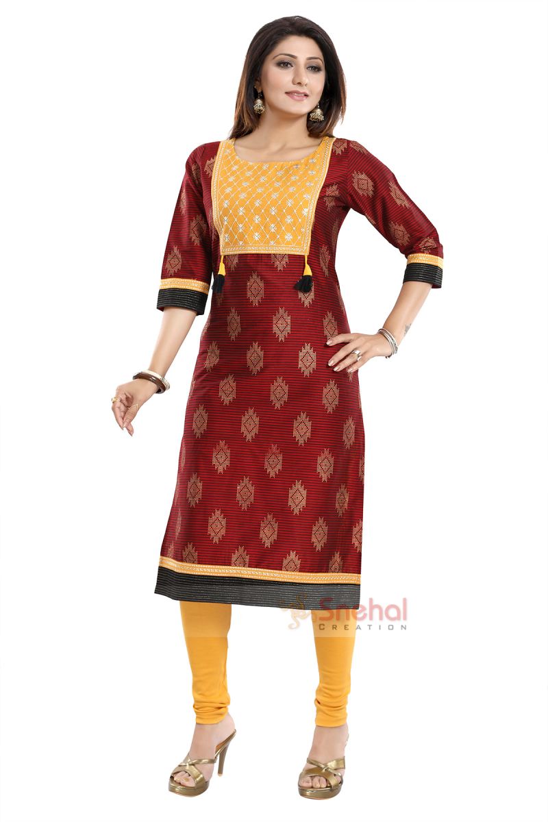 Revel in the supreme elegance of this Ethnic Fiesta Maroon Raw Silk Tunic from the house of Snehal Creations. This round neck tunic is structured out of subtly printed maroon raw silk fabric with a yellow neck panel that comes decorated with black pom pom accessory. Yellow and black fabric are used to provide taping at the sleeve edges in a neat manner. With a black set of jeans, this one is set the stage on fire.