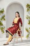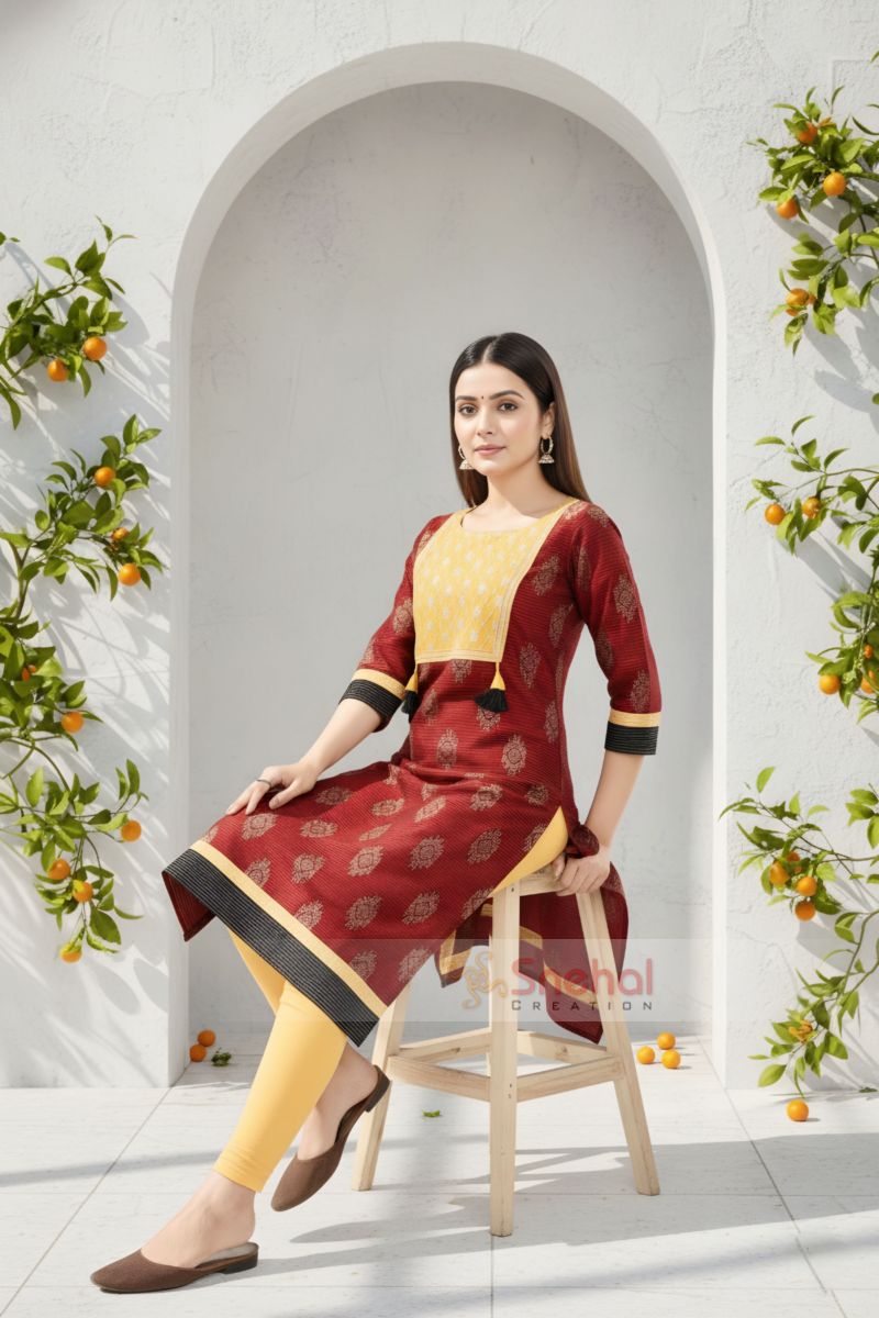 Revel in the supreme elegance of this Ethnic Fiesta Maroon Raw Silk Tunic from the house of Snehal Creations. This round neck tunic is structured out of subtly printed maroon raw silk fabric with a yellow neck panel that comes decorated with black pom pom accessory. Yellow and black fabric are used to provide taping at the sleeve edges in a neat manner. With a black set of jeans, this one is set the stage on fire.