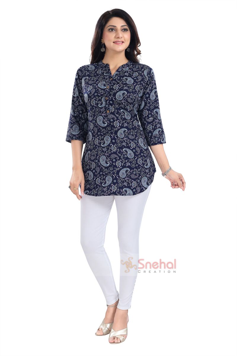Proceed with prestige in this Ethnic Galore Blue Paisely Print Short Tunic Top for Women from Snehal Creation. Made out of Poly Crepe fabric, this Chinese collared Tunic has a buttoned gala Patti. The Tunic is asymmetrical at the Base. It has three quarter sleeves and is a great pick for the season.