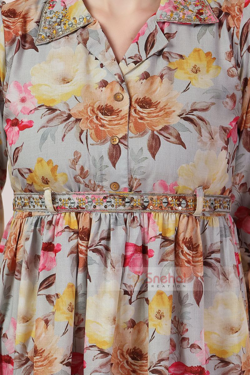 Ethnic Multicolor Flower Print Cotton Co-Ord Set With Shirt Collar and Belt having mirror work. This Co-ord set comes with a embroidered belt separately and matching pant.
