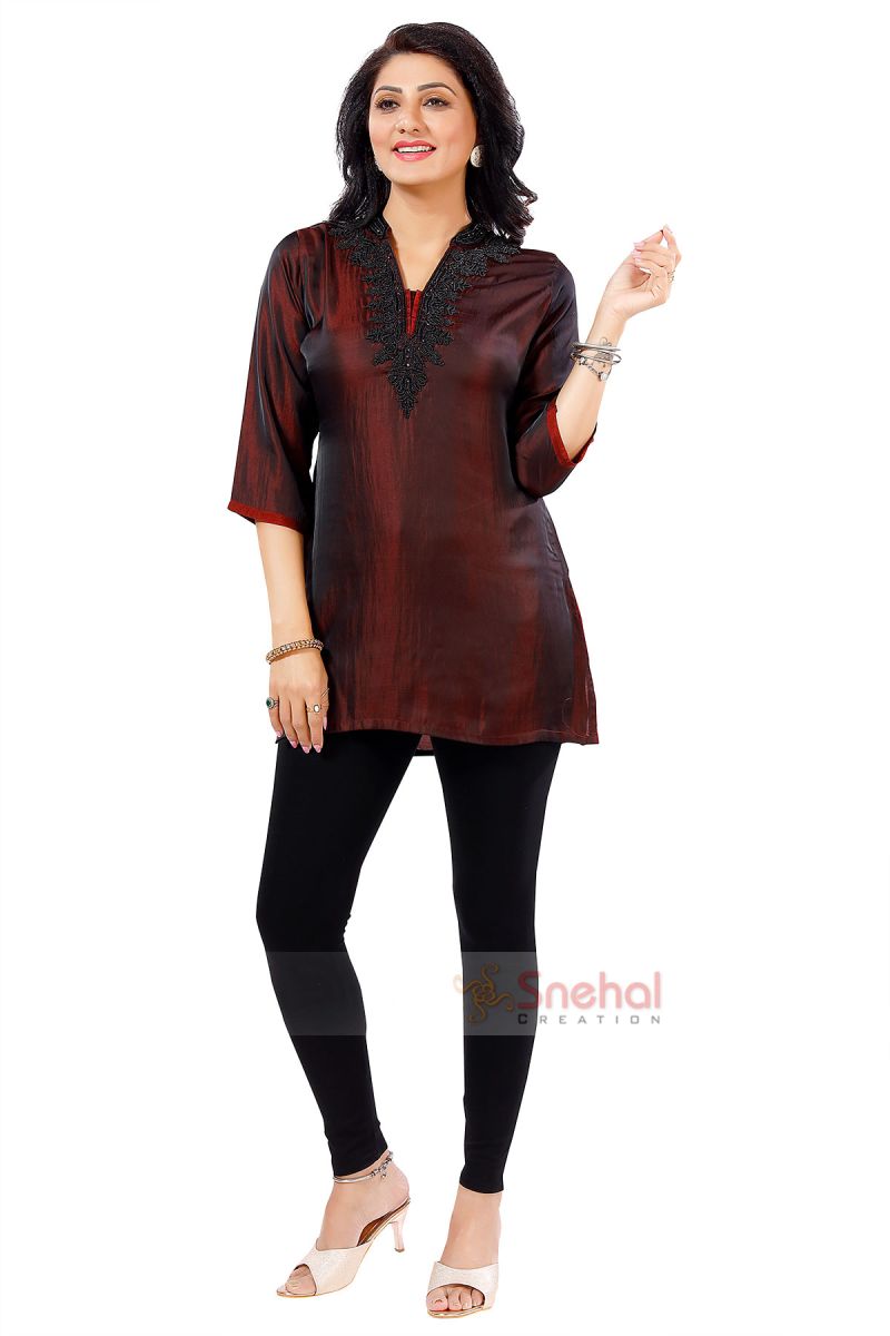 There are trends that run around the season everywhere and then there are path-breaking styles that make you stand and ogle at them due to their distinctness, like the one here by Snehal Creations. This exceedingly elegant Soft Silk tunic top comes with superior comfort. Black beadwork all around the ban neck collar, neck panel are an instant eye candy for any connoisseur of beauty. A fine red taping at the edges of sleeves and the base of tunic is an essential inclusion to the finishing of this design. Experiment with different hues of salwaar to perk it all us here!
