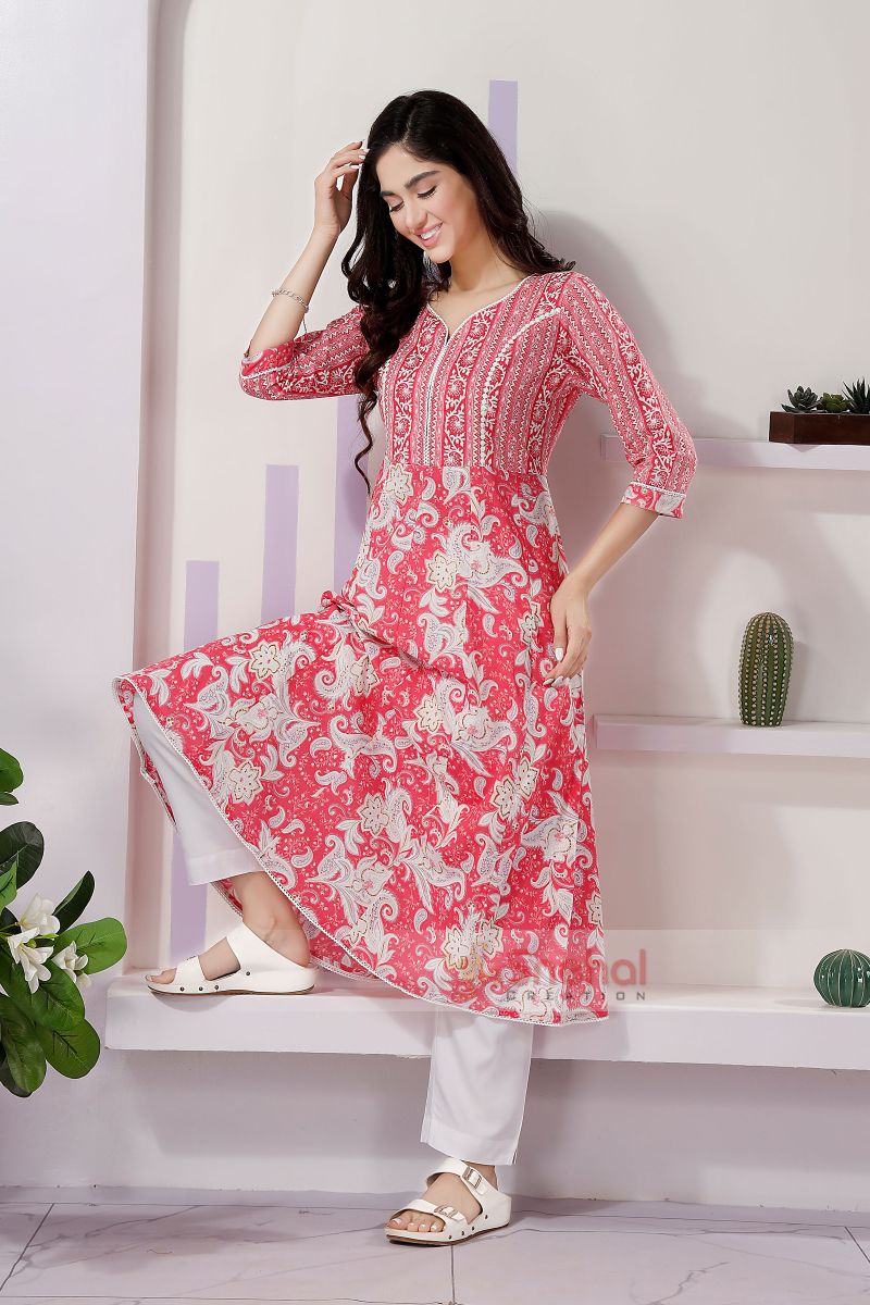 Discover elegance with our Fashionable Coral Anarkali Kurti, crafted from high-quality cotton for unmatched comfort and style. This kurti features a vibrant coral hue, beautifully complemented by mixed print patterns that add a unique and contemporary touch. The Anarkali silhouette provides a flattering fit, while the breathable cotton fabric ensures all-day comfort. Perfect for casual outings, festive occasions, or everyday wear, this kurti combines traditional charm with modern aesthetics. Pair it with your favorite leggings or palazzos to complete the look. Embrace the blend of style and comfort with this must-have addition to your ethnic wardrobe.