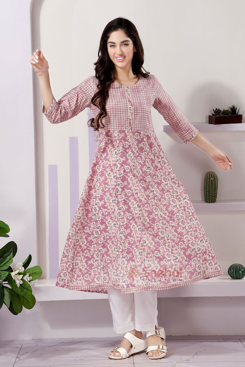 Discover elegance with our Fashionable Pink Anarkali Kurti, crafted from high-quality cotton for unmatched comfort and style. This kurti features a vibrant coral hue, beautifully complemented by mixed print patterns that add a unique and contemporary touch. The Anarkali silhouette provides a flattering fit, while the breathable cotton fabric ensures all-day comfort. Perfect for casual outings, festive occasions, or everyday wear, this kurti combines traditional charm with modern aesthetics. Pair it with your favorite leggings or palazzos to complete the look. Embrace the blend of style and comfort with this must-have addition to your ethnic wardrobe.