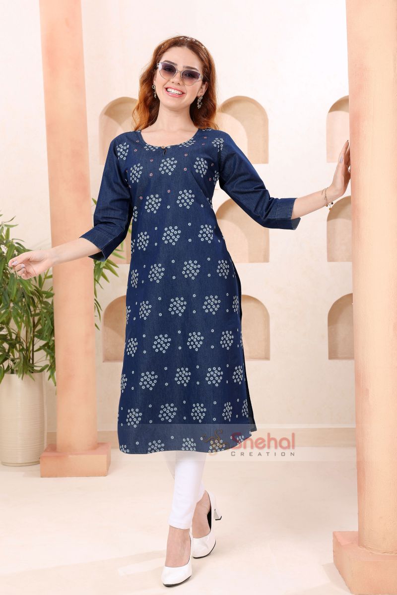 Fashionable Boat Neck Denim Kurti With Hand Embroidery