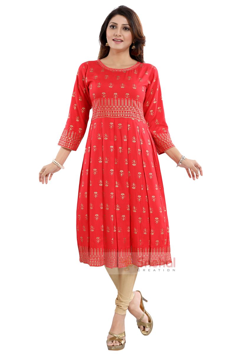 Jazz up an ordinary day by dressing up in this Flamboyant Red Rayon Printed Frock Style Tunic with Block Pleats from the house of Snehal Creations. This simple yet elegant piece of ethnic Indian clothing is stitched to have a frock style silhouette with box pleats to add grace. The subtle golden motifs and border printed on various parts of the tunic make it look royal and ethereal. The piece features a round neckline and three fourth sleeves. Team it up with a pair of golden pants and move the party home.
