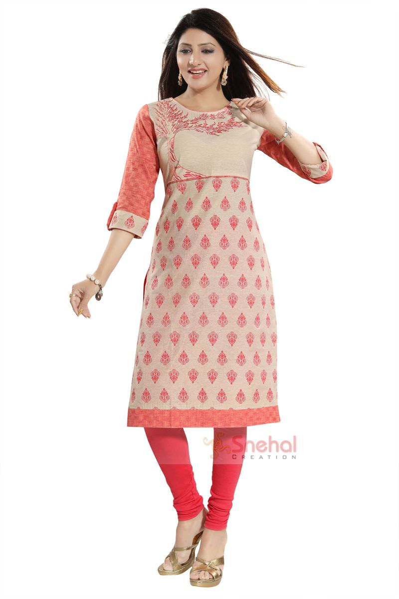 Parade through the town in the vibe of this Flamboyant Tomato and Beige Cotton Printed Tunic with Intricate Thread Work from the house of Snehal Creations. This round neck piece of Indian wear clothing is designed to offer full comfort to women throughout all seasons. The designer approach used to craft this piece has segregated the yolk of the main body to feature thread work on a plain beige base and the rest of the body is tailored out of uniformly printed fabric. The sleeves of the tunic are created out of tomato coloured printed fabric and feature broad taping or printed beige fabric.