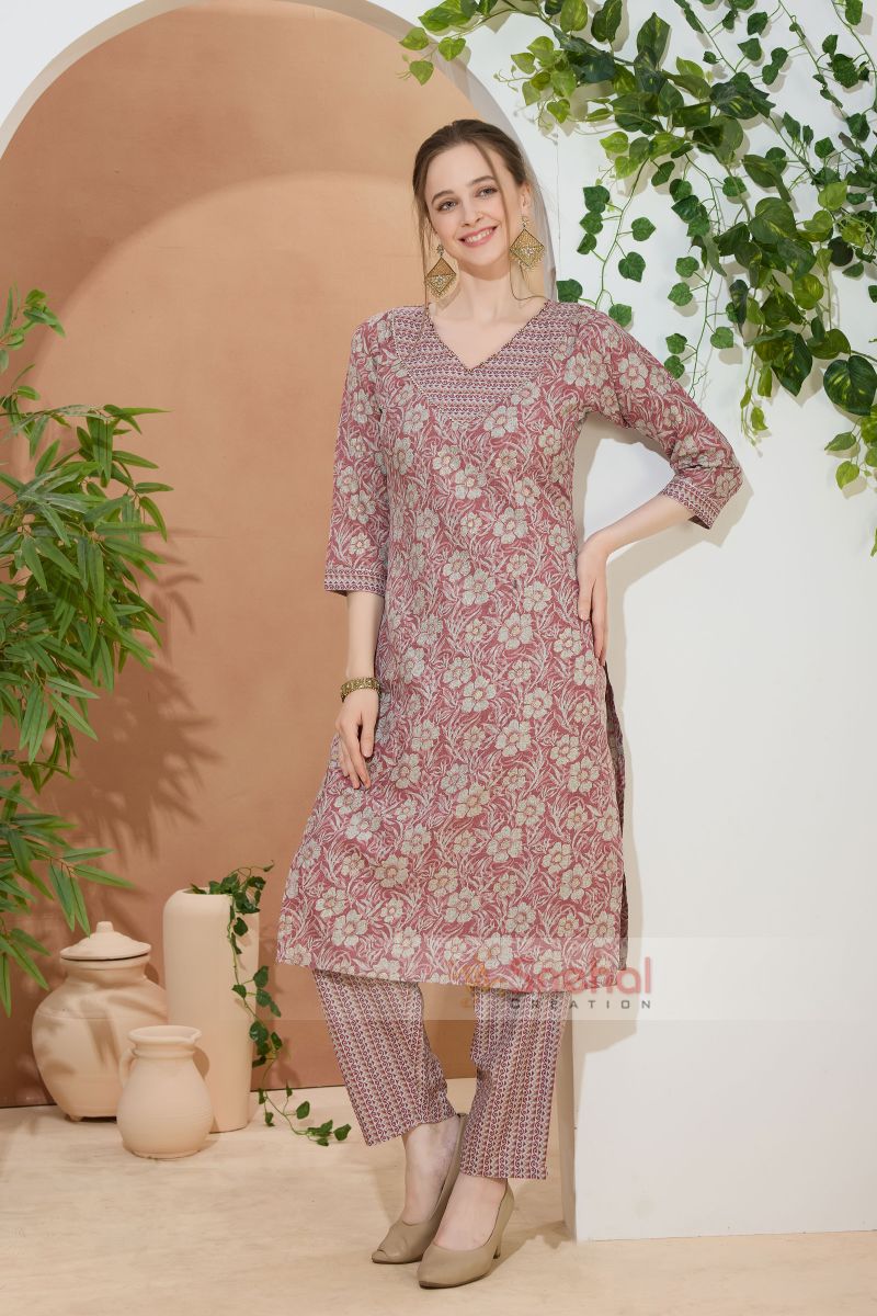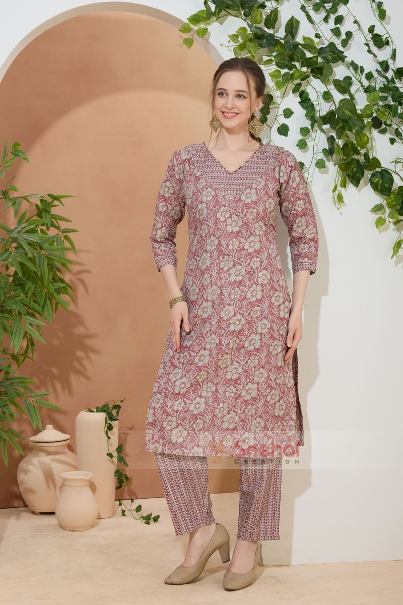Adorable Coral Round Neck Kurti Pant Suit For Women