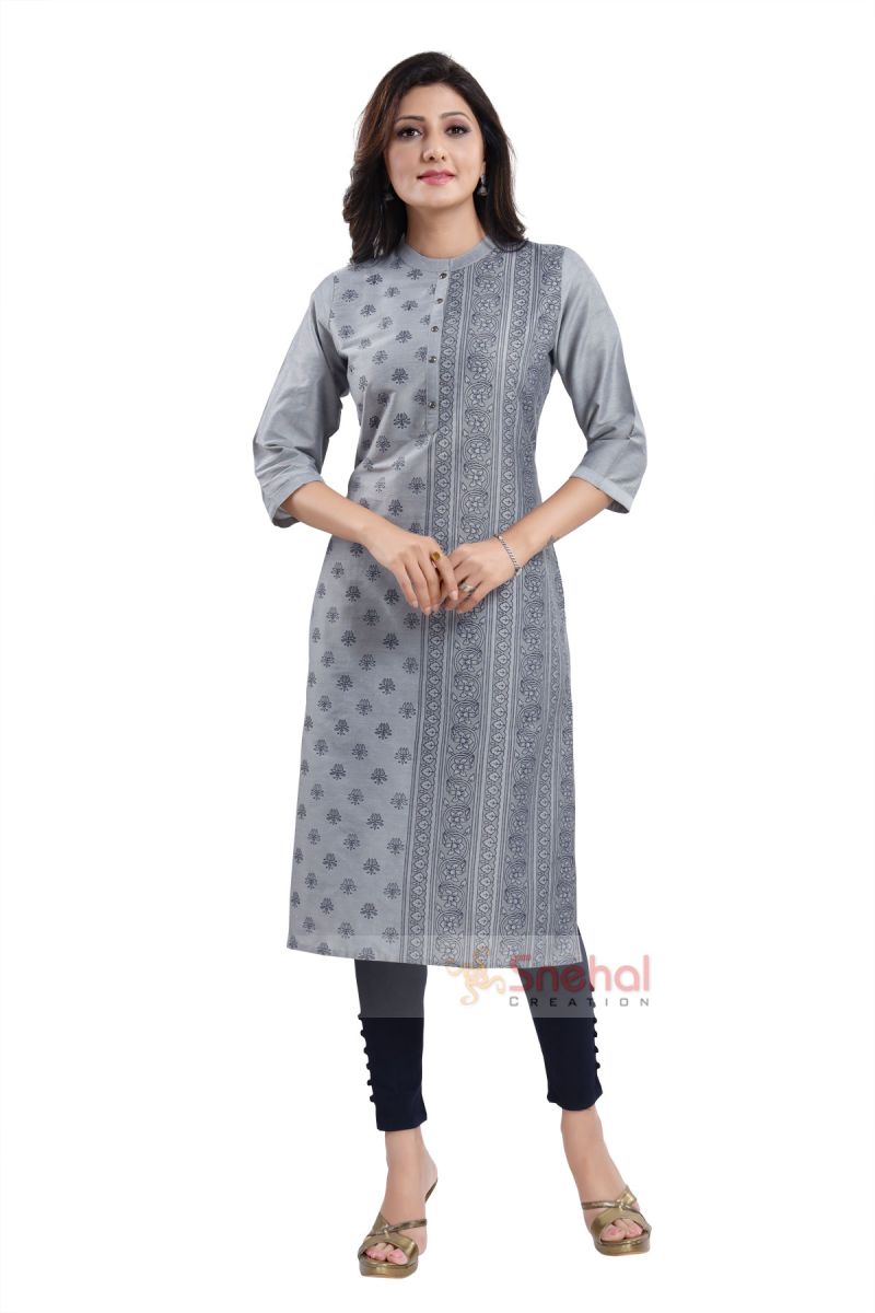 Enjoy the sparkle in subtlety as you narrow down on this Secret Shimmer Cotton Silk Formal Wear Tunic for Women from the house of Snehal Creations. This round naeck tunic is made up of metallic copper and comes with brown print asymmetrical design. The tunic has three quarter sleeve and sequence and thread work on edges.