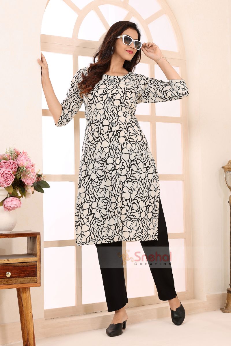 Chic In Black Linen Cotton Round Neck Women Long Kurta