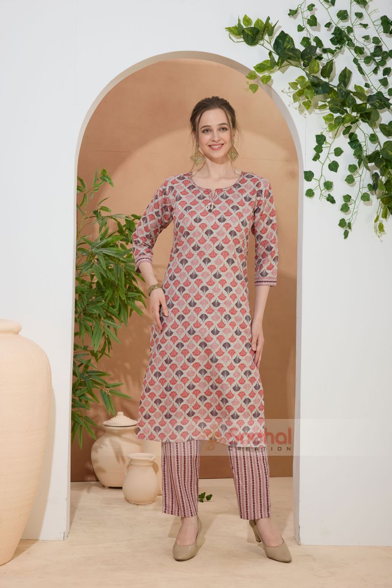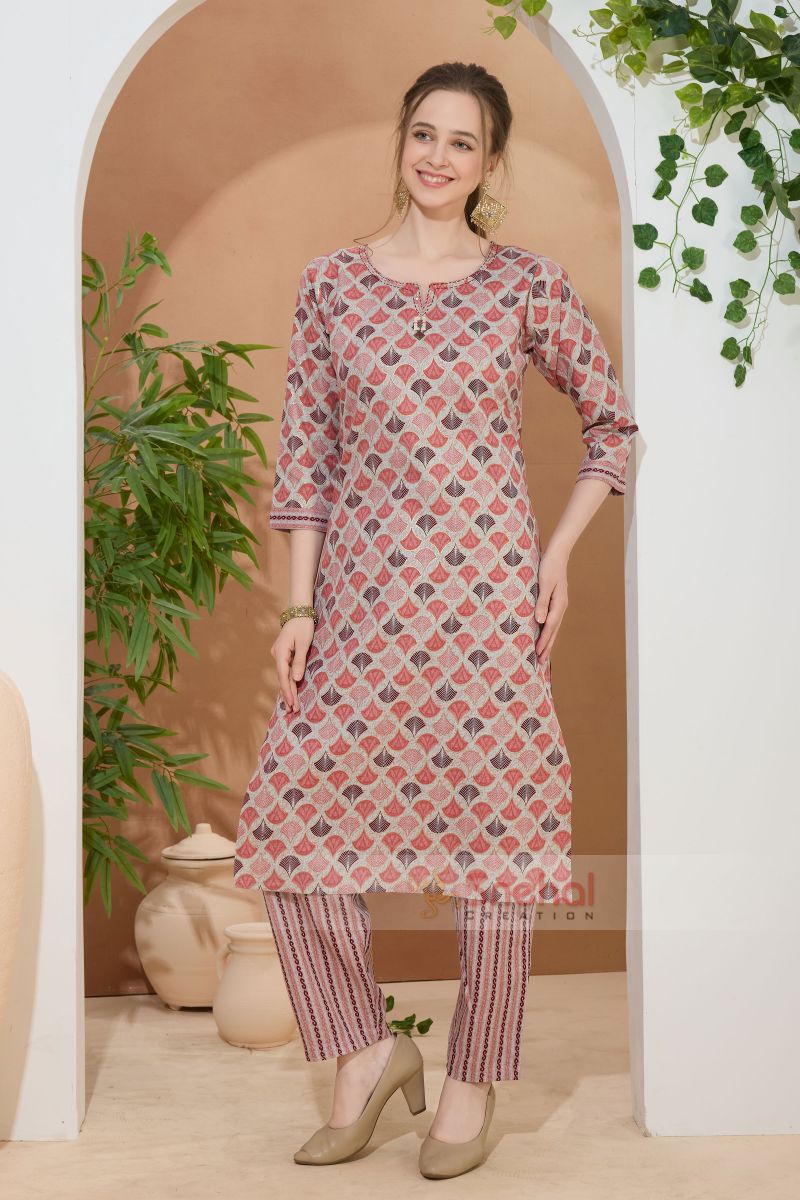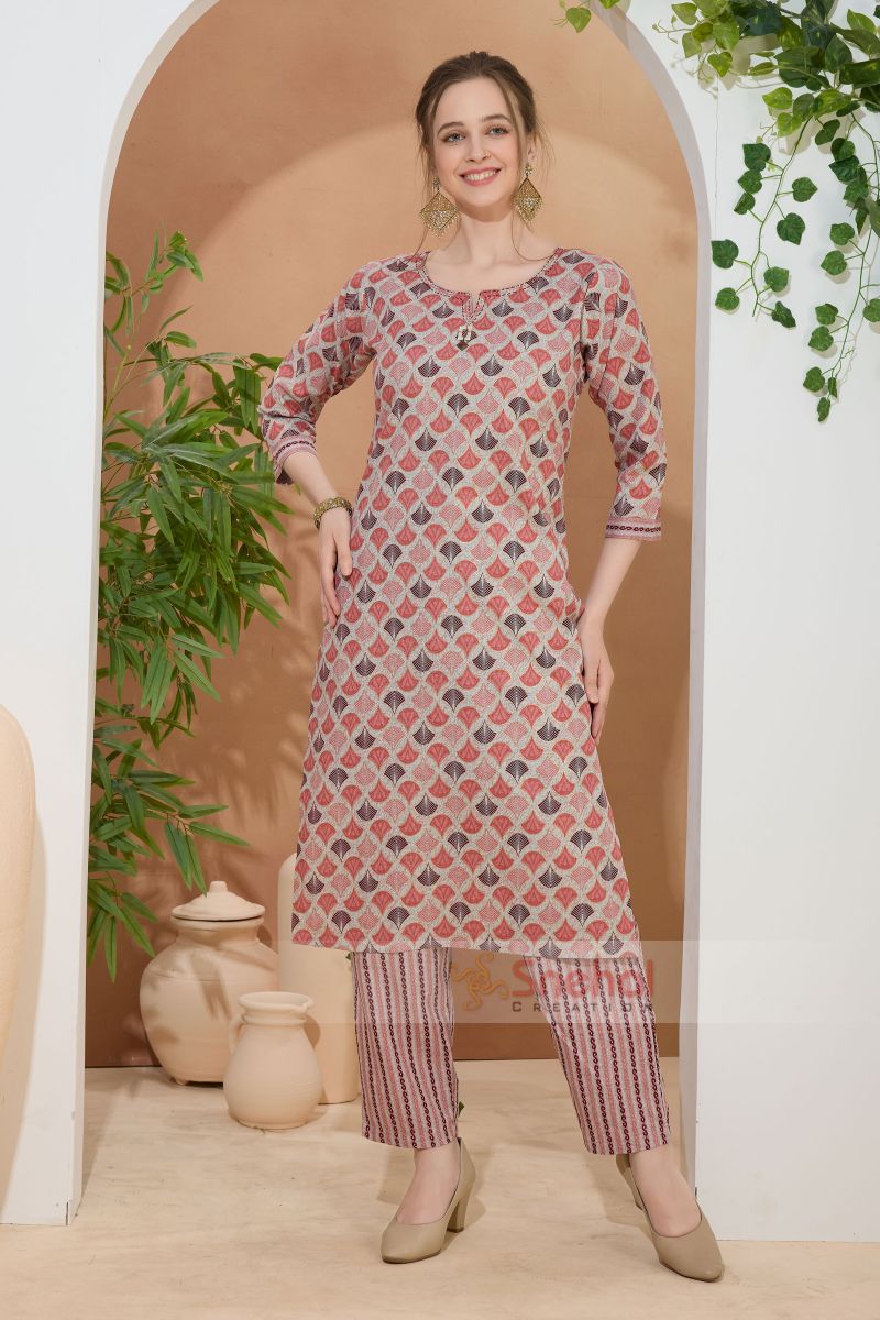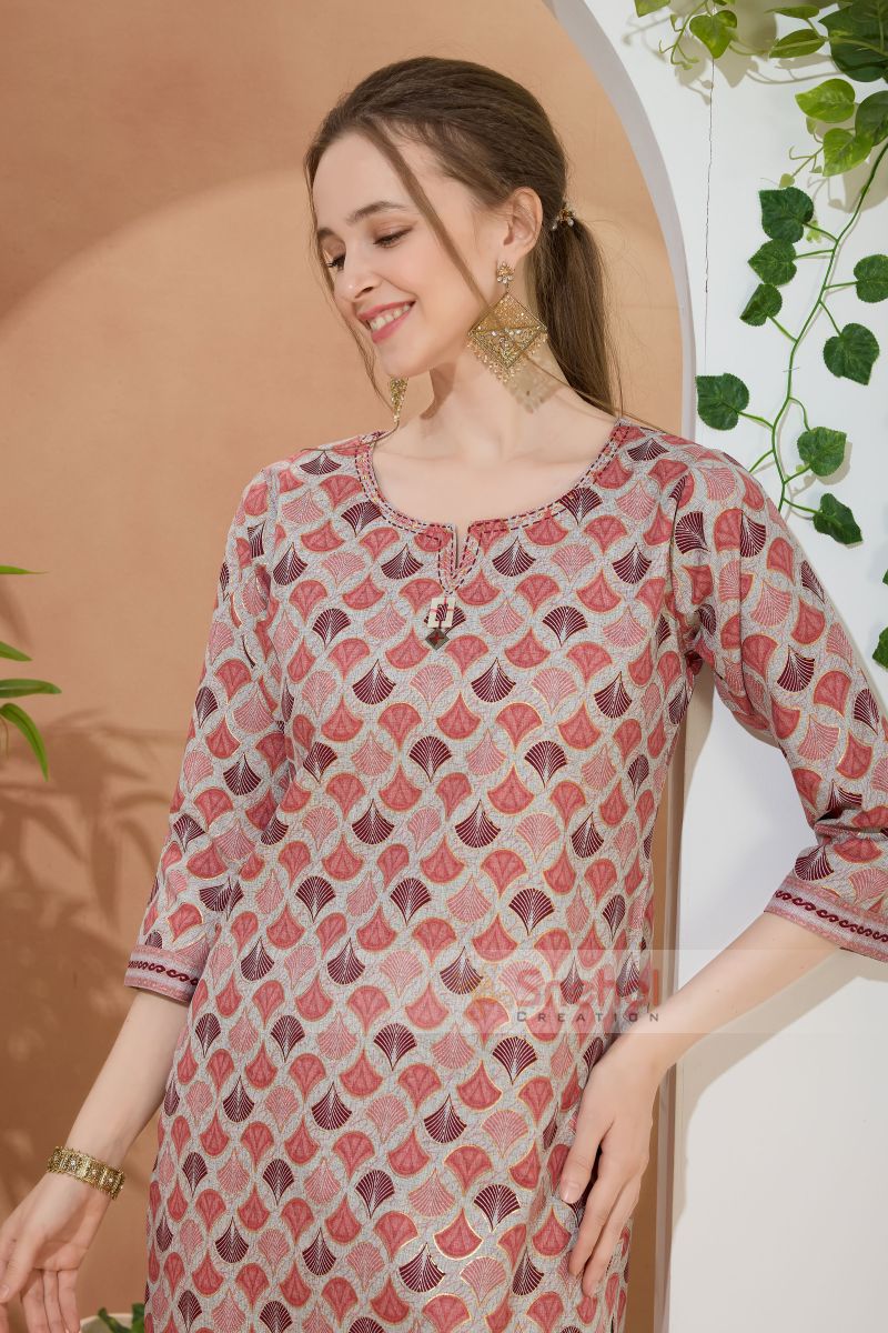 Glossorial Coral Round Neck Kurti Pant Suit For Women. Embellished with Golden Beads and Thread Work.