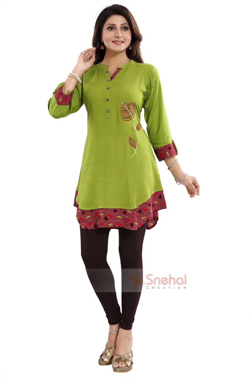 Level up the ethnic fashion game with this Gorgeous Designer Green Rayon Embroidery Tunic for Girls and Women from the house of Snehal Creations. This a-line tunic is short in length and comes with a ban collared neckline along with three fourth sleeves. The body of the tunic features a thick printed border at the edges as well as designer thread work. Printed roll up cuffs decorate the sleeves of the piece. Jazzed up with wooden buttons, it is an absolute show stealer.