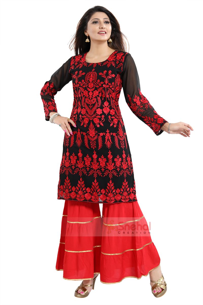 Exude the exuberance and sophistication in this Gorgeous Grace Pakistani Style Embroidered Short Kurti For Women from the house of Snehal Creations. This fine georgette short tunic offers superior comfort to anyone who chooses to wear it. Flamboyant red embroidery decorates the tunic all over the front and sleeve edges. The piece features three fourth sleeves, a simple round neckline and is great when paired with a pair of red sharara, as in the picture.