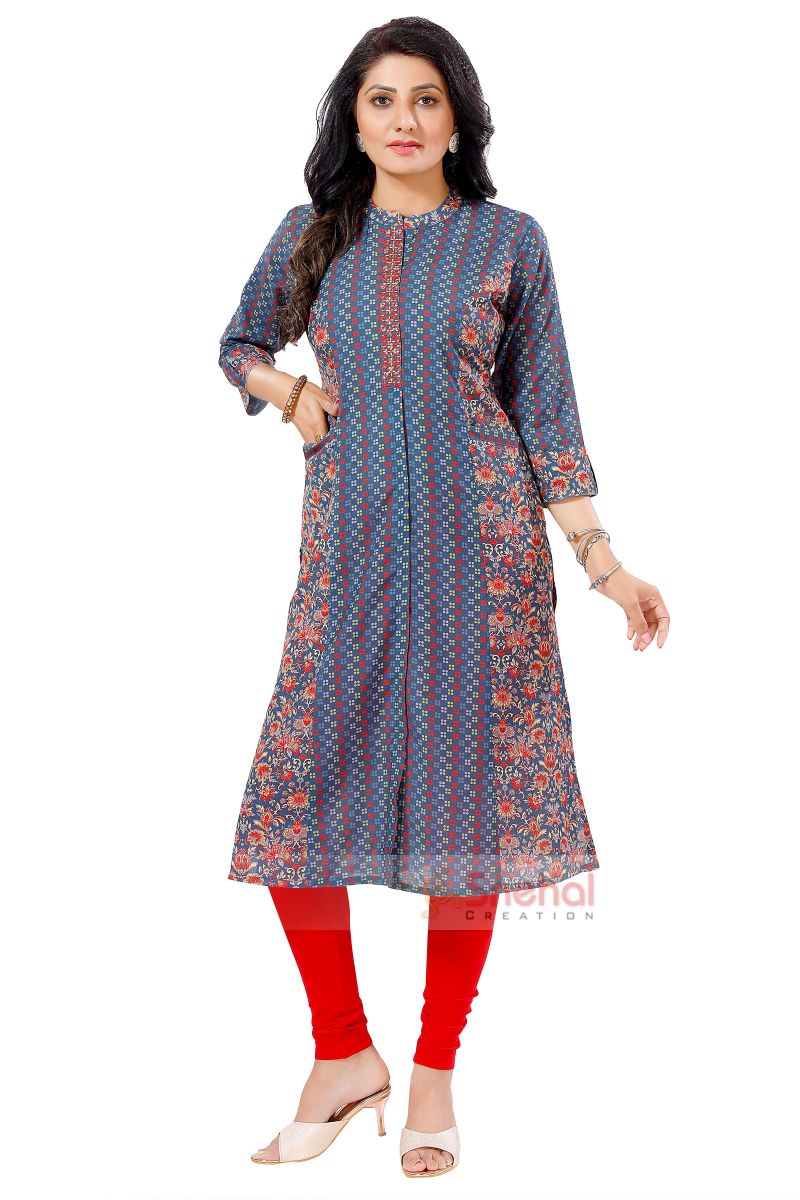 The design of the Gorgeous Gray Cotton Print A-Line Kurta for Women is a blend of traditional and modern elements. The kurta is made from soft cotton fabric, which is breathable and comfortable to wear. The gray fabric is printed with an all-over block print pattern in shades of blue and white, which gives the kurta a subtle yet elegant look.