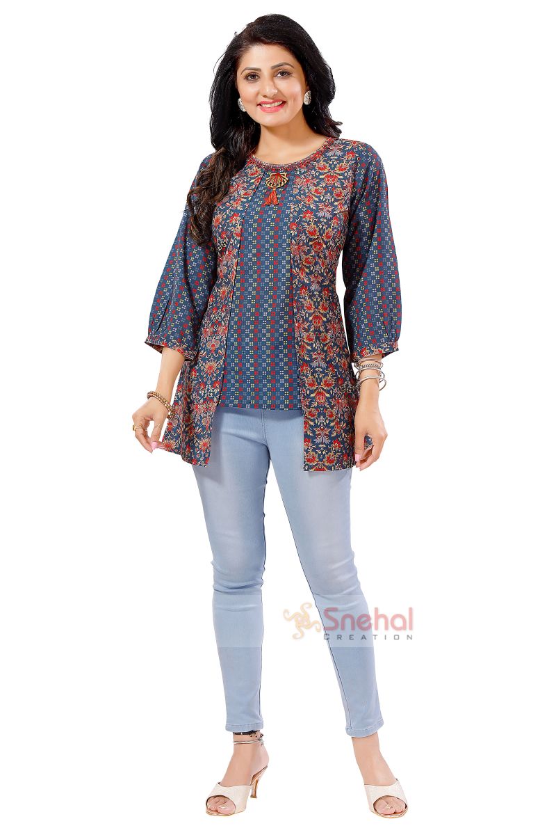 Gorgeous Gray Designer Cotton Tunic Top For Fashionistas from the house of Snehal Creation. This Stylish Tunic has beautiful thread embroidery at the neckline with wood finish broach and tassel. A combination of jaipuri print and jeometric print with up-down pattern makes it perfect to wear over jeans.