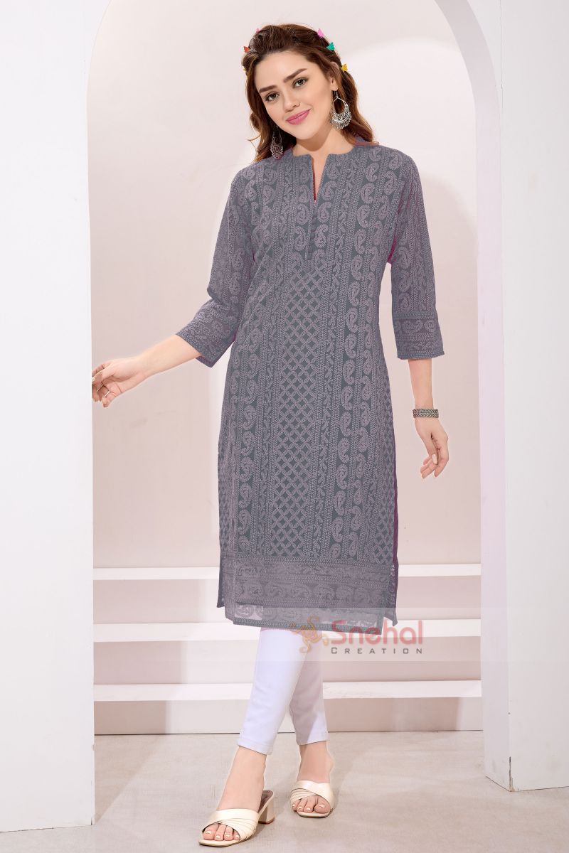 Gorgeous Gray Fine Georgette Chicken Embroidery Kurta for Women