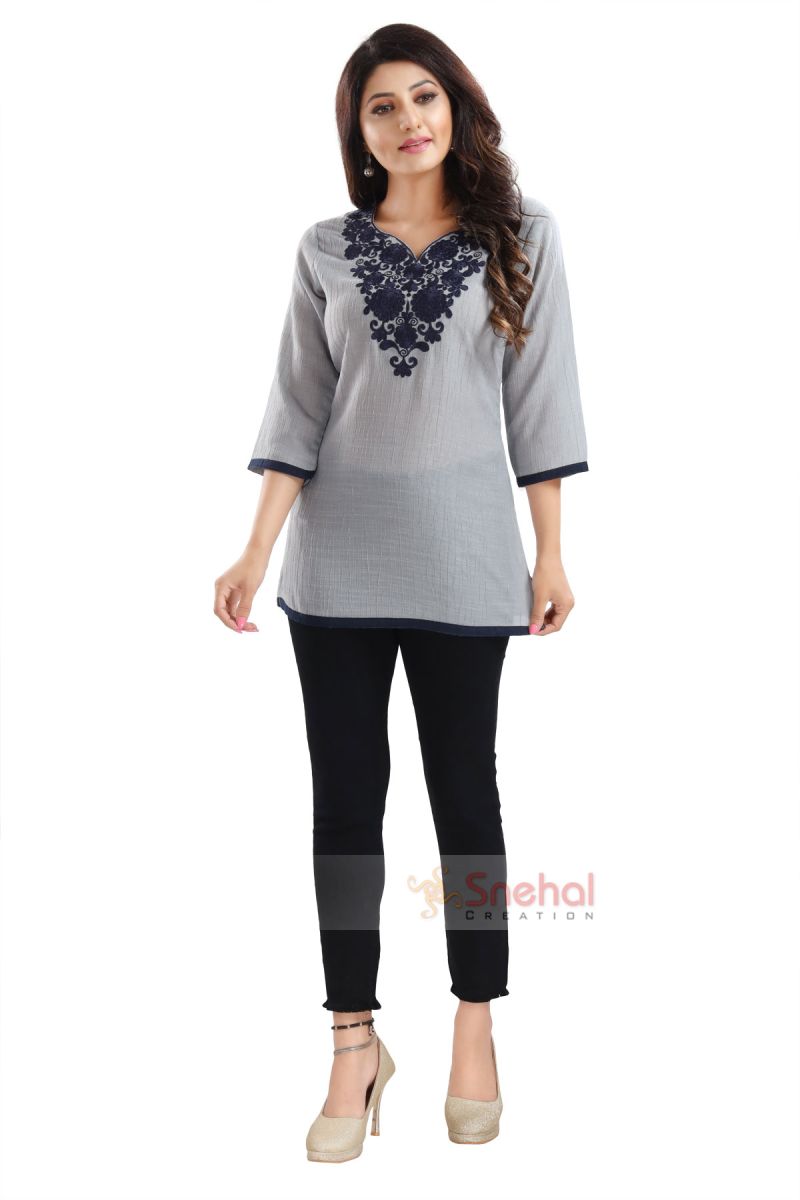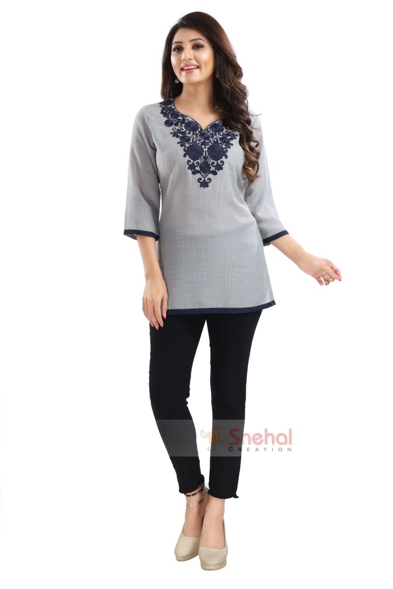 Gorgeous Grey Wrinkle Fabric Embroidery Tunic Top