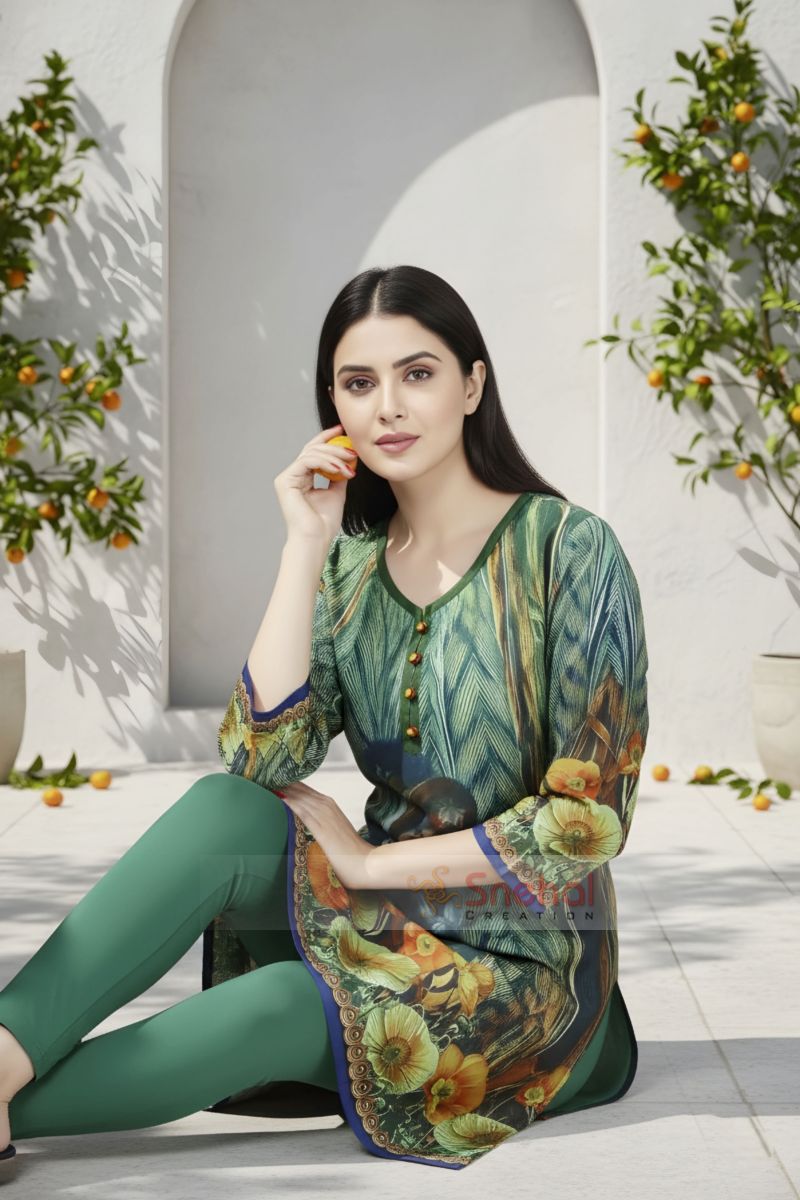 Going casual and going stylish are synonyms when you wear this Graceful Digital Print Tunic with Abstract Print Design brought to us by Snehal Creation. The short kurta is an amalgamation of varied prints floral, geometric, figurative and otherwise. The round neck of the kurta is designed to have a same coloured taping with a buttoned front panel. This chic piece of clothing is a perfect comfort day wear that can be paired with any lower option. Get ready to adorn yourself in this free-spirited attire now.