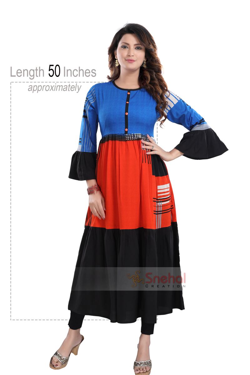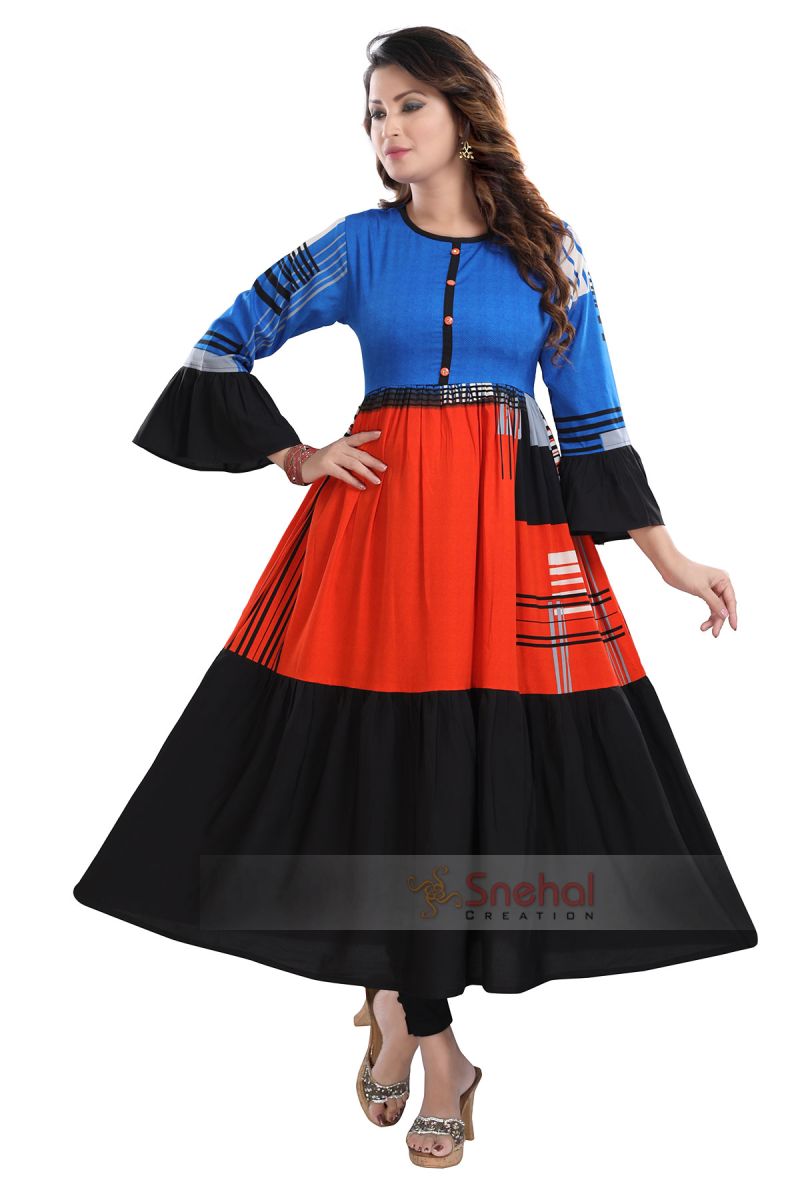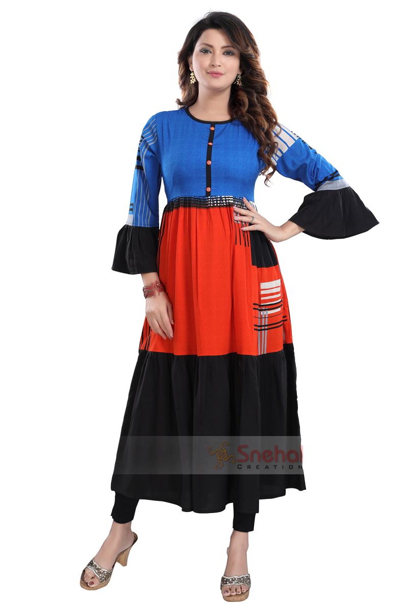 Made in graceful and charming orange hue,this kurti from the house of Snehal Creation is an elegant definition of traditional simplicity . Flared Long sleeves and round neck add to the asymmetric geometric print pattern which is further accentuated with the bring color tones. To add more style to it.