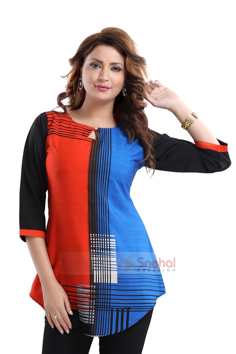 Graceful Ladylike Orange And Blue Poly Crepe Short Tunic