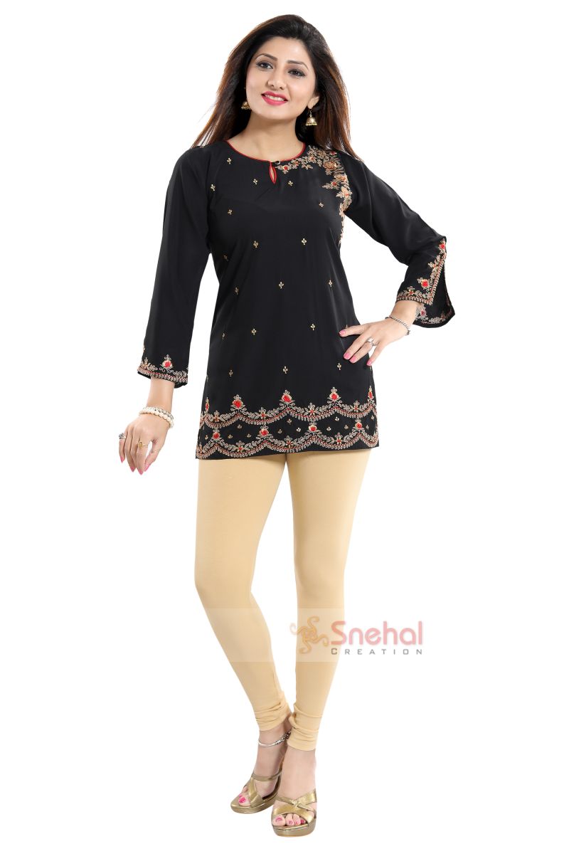 Dressing up for the afternoon tea at the club is never a hectic affair when you have this beautifully curated black designer kurti in your closet. A design by Snehal Creation, this short tunic piece from our Women Kurti Collection has been tailored out of a superior quality faux crepe fabric in black colour. The elegant factor in the Kurti is its charming embroidery design that comes decked with embellishments at upper part of the tunic and even the sleeves. The deep cut of the bell sleeves give it an evident edge over the other tunics you have.