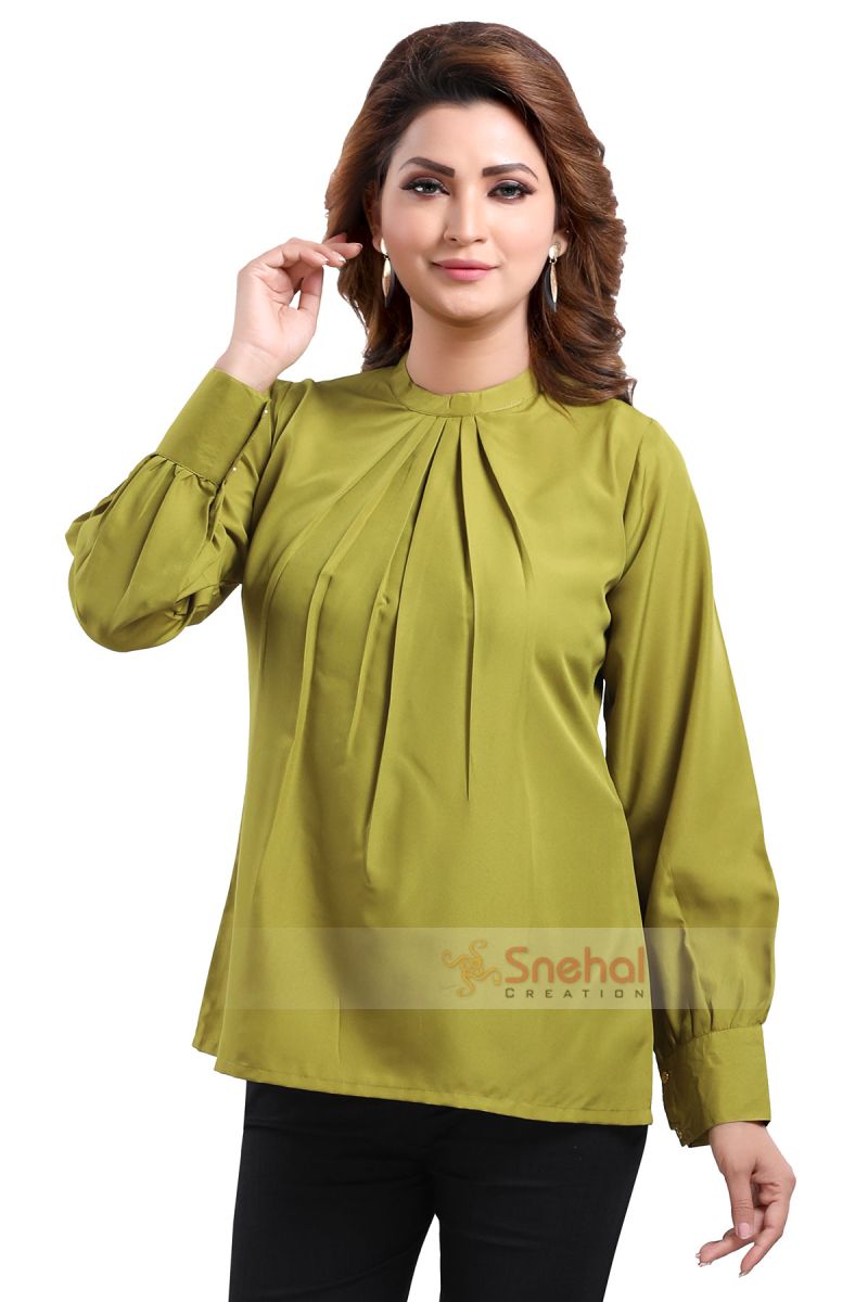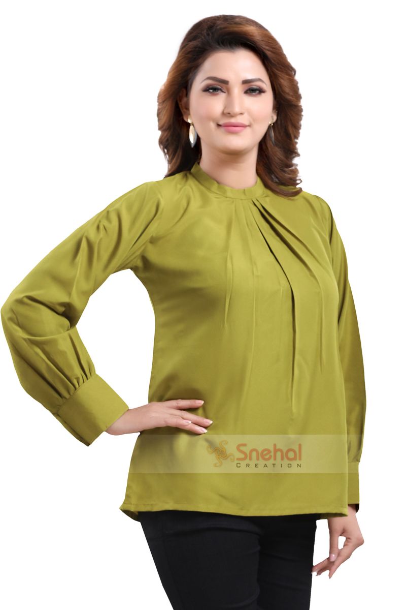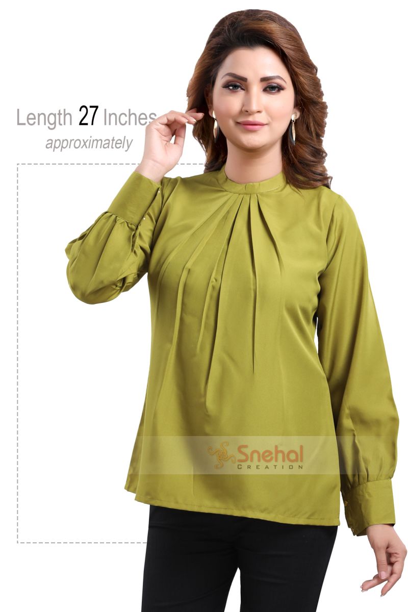 Set the bars of office wear high by styling this gracious green polyester crepe office wear short tunic top exclusively designed and sold by Snehal Creation. It is a subtle short-length with long sleeves that has buttons of the cuffs. It has a pleated design starting from the ban collar type neckline which looks very flattering. It is a plain top of green color that has no prints and is made from the finest quality of polyester crepe. It fits like a dream and will look perfect with solid black pants.