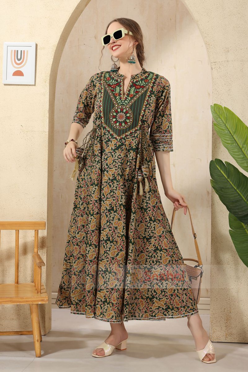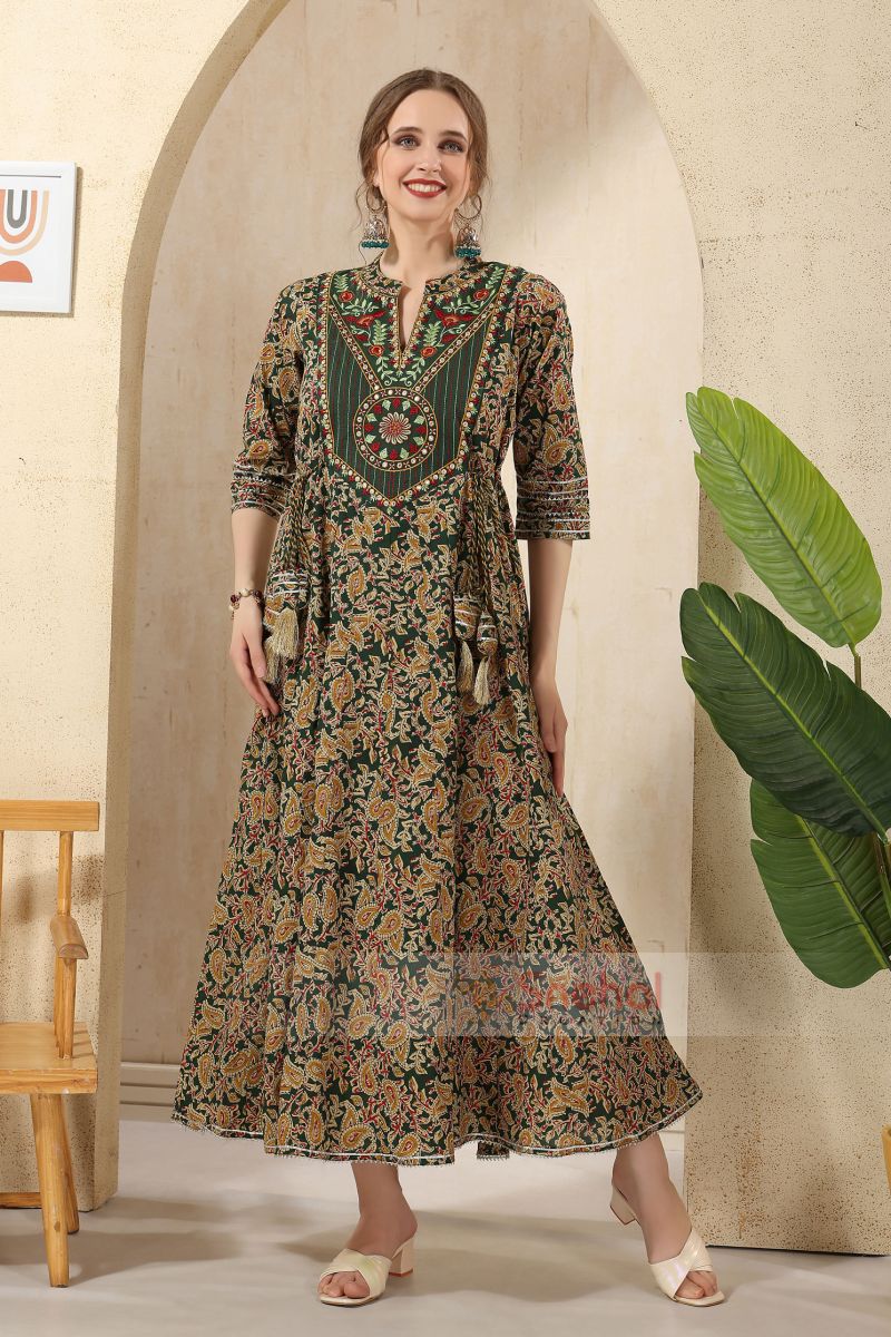 Green Cotton Paisley Print Anarkali With Embroidery Yoke And Tussles