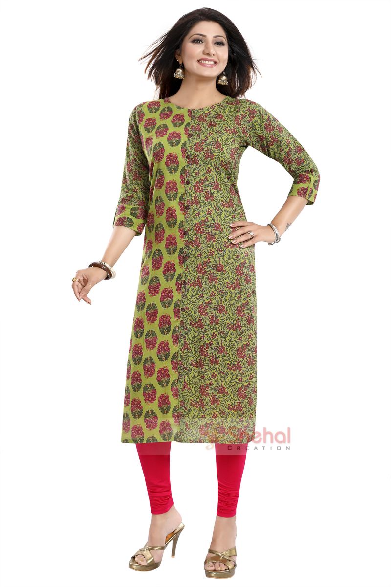A favourable choice for all seasons of the year, this Green Mystique Cotton Printed Front Open Tunic with Wooden Buttons from the house of Snehal Creations steals hearts. This ban collared piece is a modest design with three quarter roll up designer sleeves. The tunic uses two distinctly printed fabrics that look desirable when stacked up against each other. The front open end of the tunic comes decorated with wooden buttons. A contrast pair of leggings will go well with the piece.