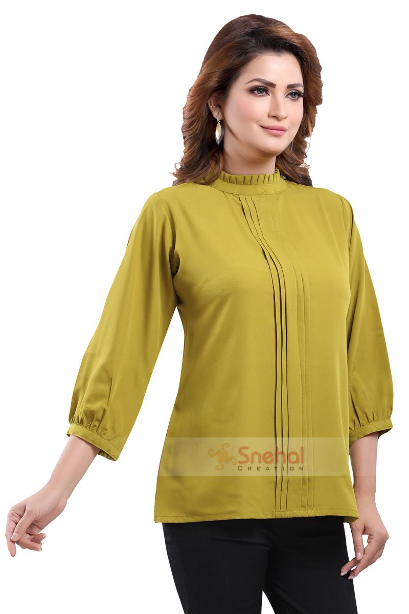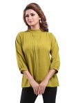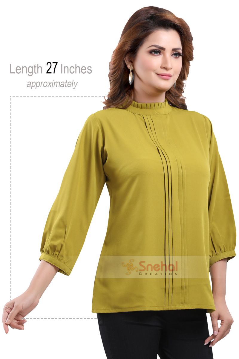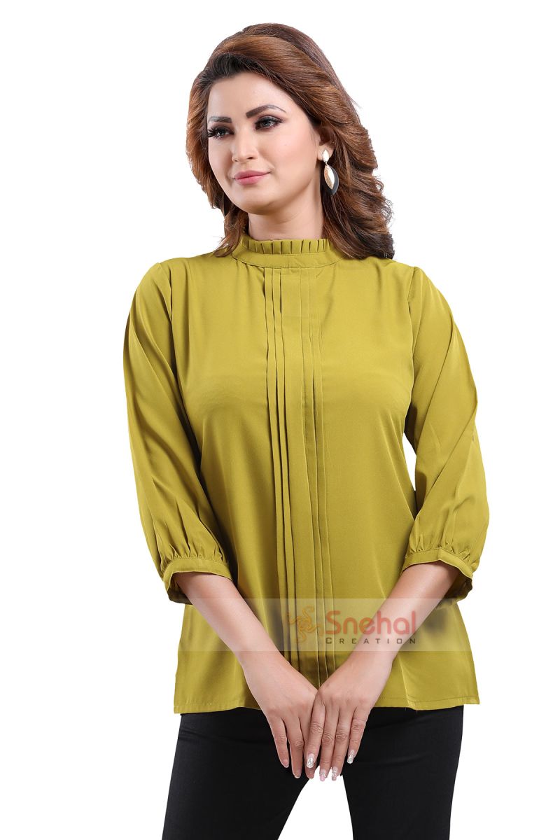 Get on your swag on a fun day out with friends as you wear this Green Poly Crepe Office Wear Short Tunic Top from the house of Snehal Creations. This short style tunic has a front pleating pattern with ban collar. Asymmetrical pleats adorn each side of the tunic. The piece comes with long sleeves and is a modern marvel when it comes to Indian clothing.