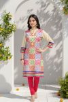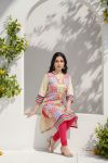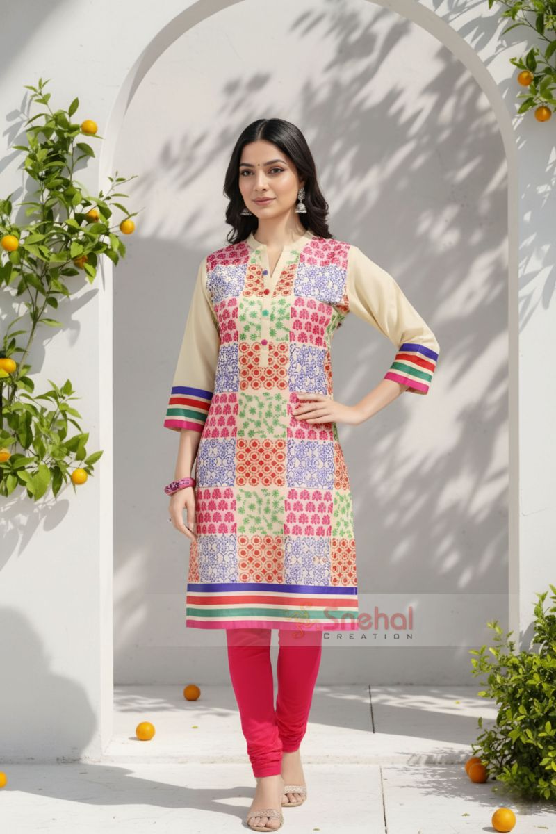 Sway everyone with the utter charm of this Heartening Harlequin Long Tunic with Exquisite Embroidery in shades of pink, blue, green and red on a dull beige base. The ban collared tunic has three fourth sleeves to go with it and additionally some multi layered taping that looks well at its edges of sleeves and the main base. The centre body of the tunic has blocks of diverse embroidery designs placed adjacent to each other all over it.