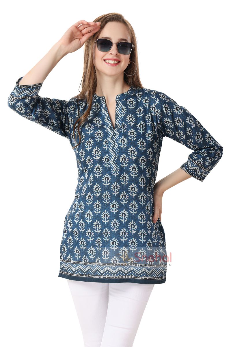 Indigo Blue Cotton Print Mandarin Collar Short Tunic Top
