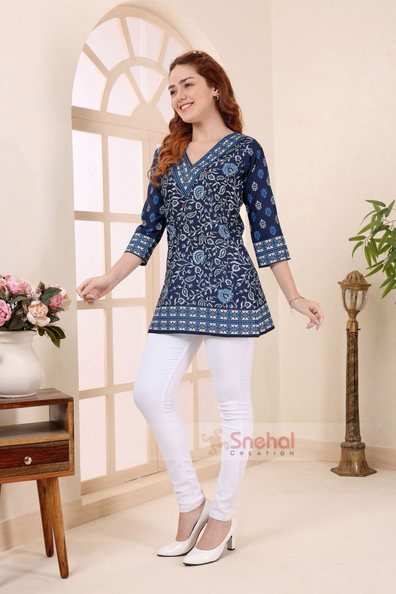 Indigo Cotton Short Kurti Tunic Top With Ethnic Motifs For Women