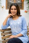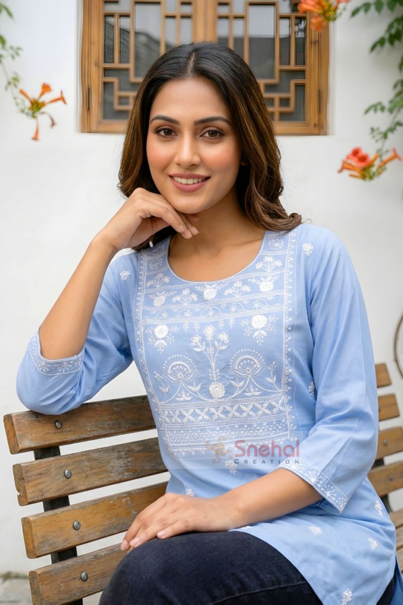 Introducing our elegant light blue rayon short kurti, a perfect blend of comfort and sophistication. This kurti features a graceful blue hue, complemented by intricate white chikankari work, adding a touch of traditional charm. The 3/4 sleeves offer a contemporary look, making it suitable for both casual and semi-formal occasions. Crafted from soft rayon fabric, this kurti ensures all-day comfort and a flattering fit. Pair it with your favorite bottoms and accessories for a chic, effortless style. Ideal for any wardrobe, this kurti is a must-have for those who appreciate classic elegance with a modern twist.