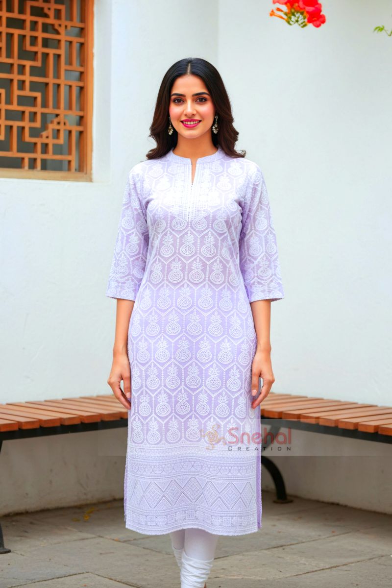 Lilac Pure Cotton Chikankari Long Kurti for Women