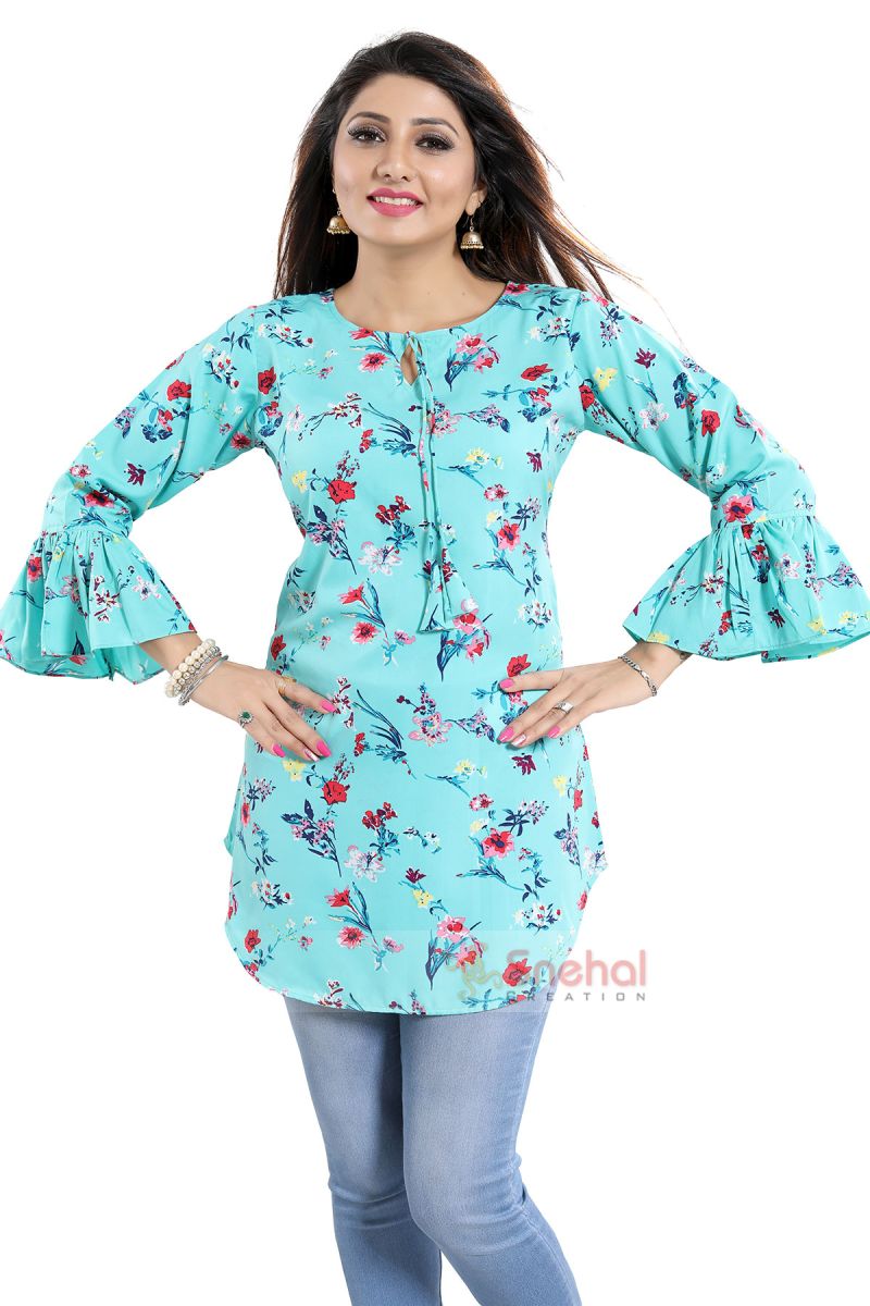 Take your style quotient a notch above as you dress up in this Lustre Light Rama Poly Crepe Apple Bottom Short Tunic Top with Frilled Sleeves from the house of Snehal Creations. This round neck short tunic top comes with a dori tie up. The body of the tunic features a straight silhouette and an apple bottom. The sleeves are three fourth and are frilled at the cuff. The short kurti is the perfect accompaniment to a pair of jeans.