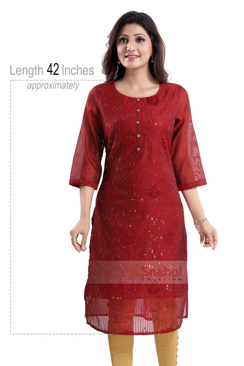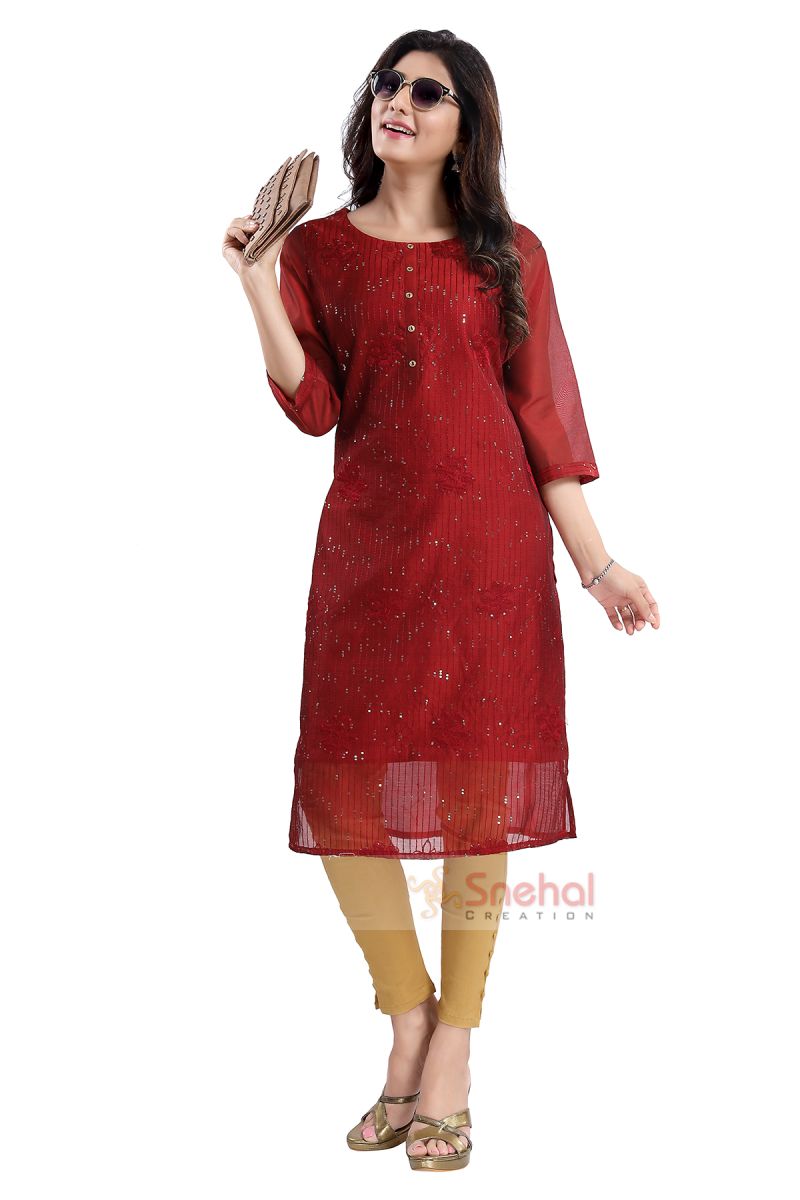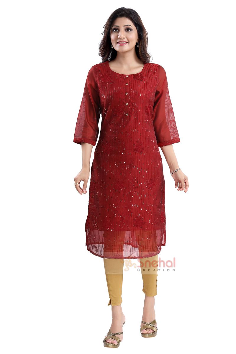 Who doesn't want a solid-colored maroon embroidered chanderi long kurta solely designed and made by Snehal Creations?. It is one of the most appropriate kurta for attending functions. It can be styled with all the alluring golden or black bottoms you have in your wardrobe. It is made of pure chanderi silk and has got overall embroidery in the front which makes it distinguished among the crowd as it is subtle yet shiny. The 3/4th sleeves and straight fit makes it comfortable yet appealing.