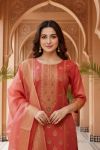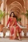 Gracefully styled in soft beige tones, this Maroon Banarasi Chanderi hand-woven women three-piece long kurta set exudes timeless elegance.