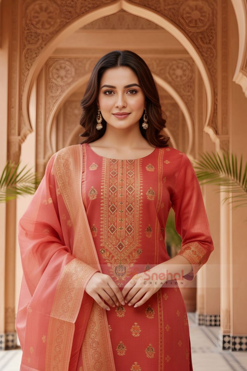 Exclusive banarasi jaquard design at the neckline, front and sleeves
