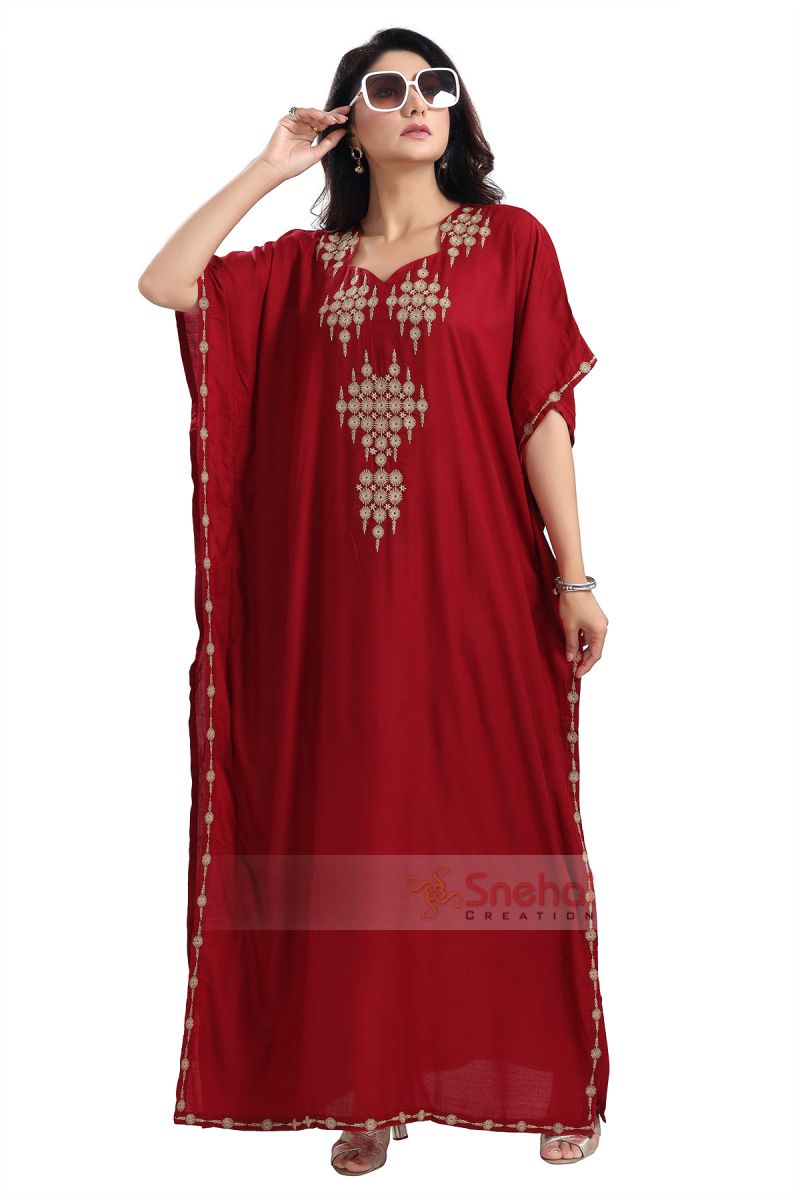 Made from lightweight rayon, this maroon beach kaftan maxi dress features elegant embroidery for added comfort. Float through your day in style, whether you are on the beach, relaxing at home, or attending a casual party.
