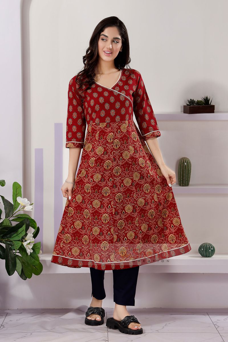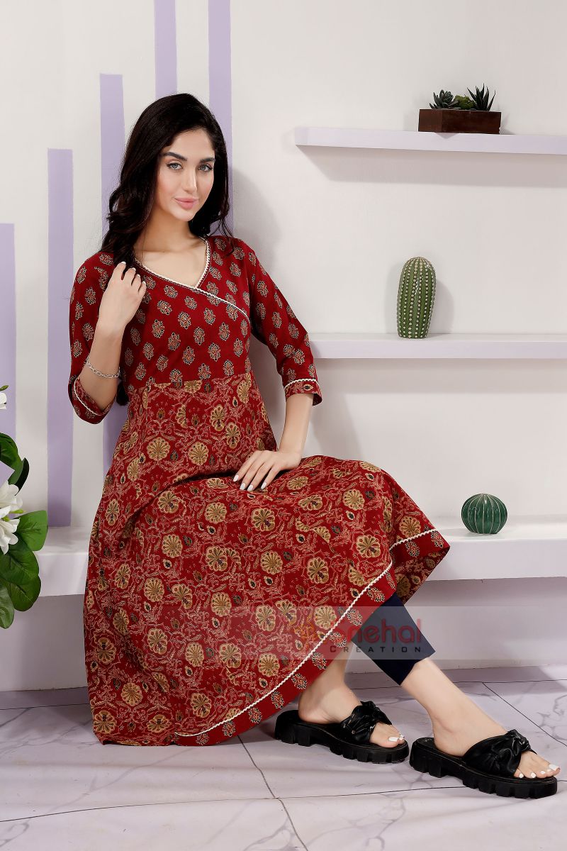Discover elegance with our Maroon Cotton Print Mix and Match Anarkali Kurti, crafted from high-quality cotton for unmatched comfort and style. This kurti features a vibrant coral hue, beautifully complemented by mixed print patterns that add a unique and contemporary touch. The Anarkali silhouette provides a flattering fit, while the breathable cotton fabric ensures all-day comfort. Perfect for casual outings, festive occasions, or everyday wear, this kurti combines traditional charm with modern aesthetics. Pair it with your favorite leggings or palazzos to complete the look. Embrace the blend of style and comfort with this must-have addition to your ethnic wardrobe.
