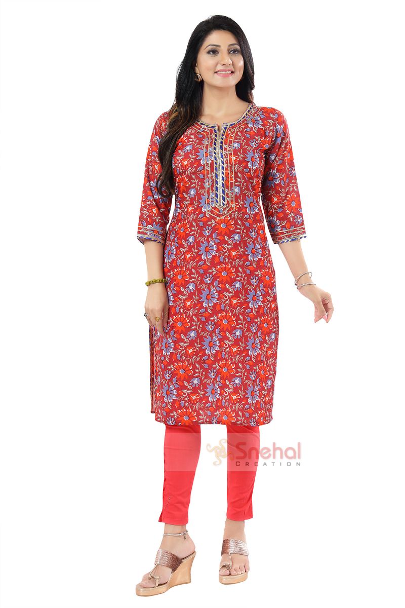 Maroon Women Printed Long Kurti Tunic With Gota Laces And Piping