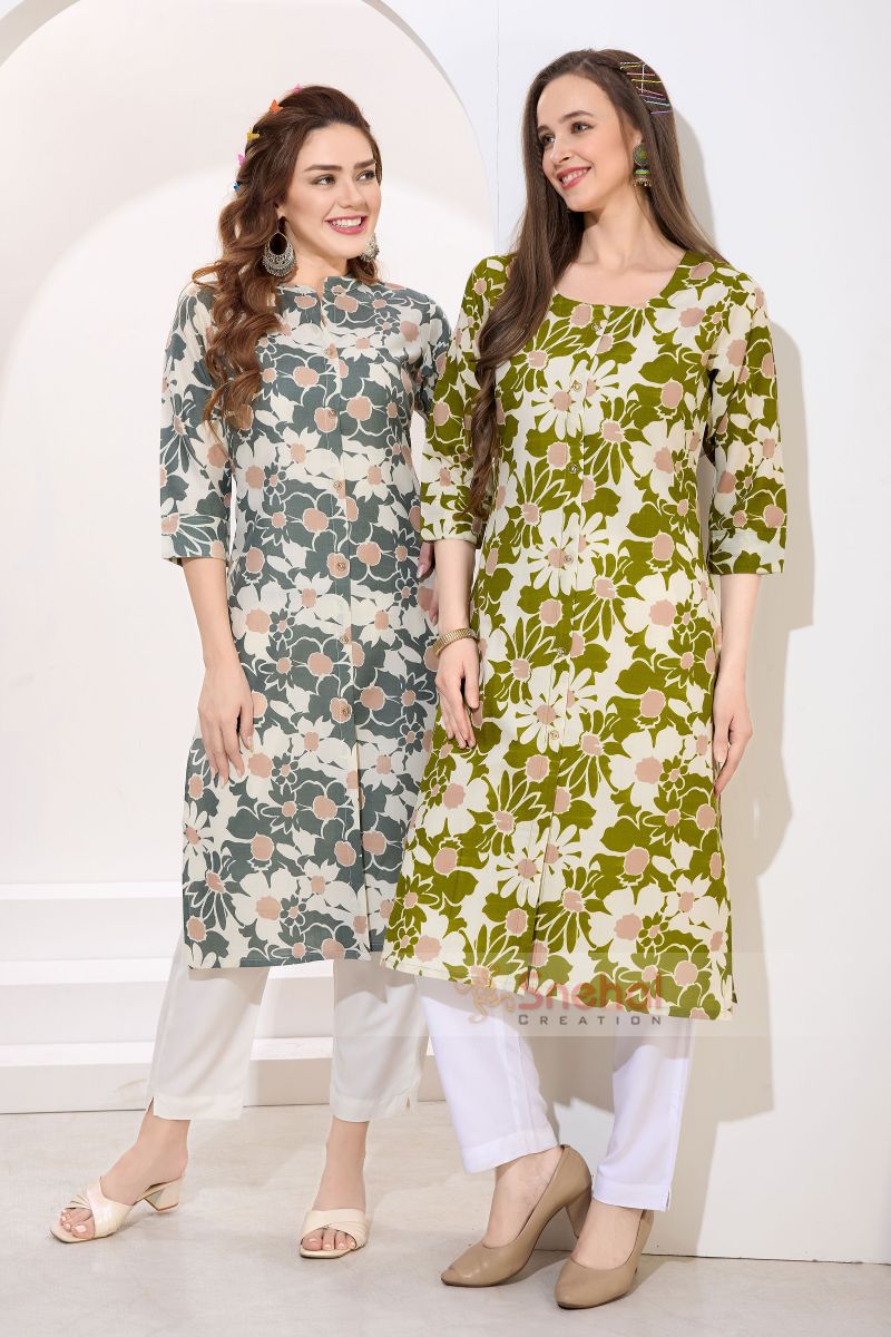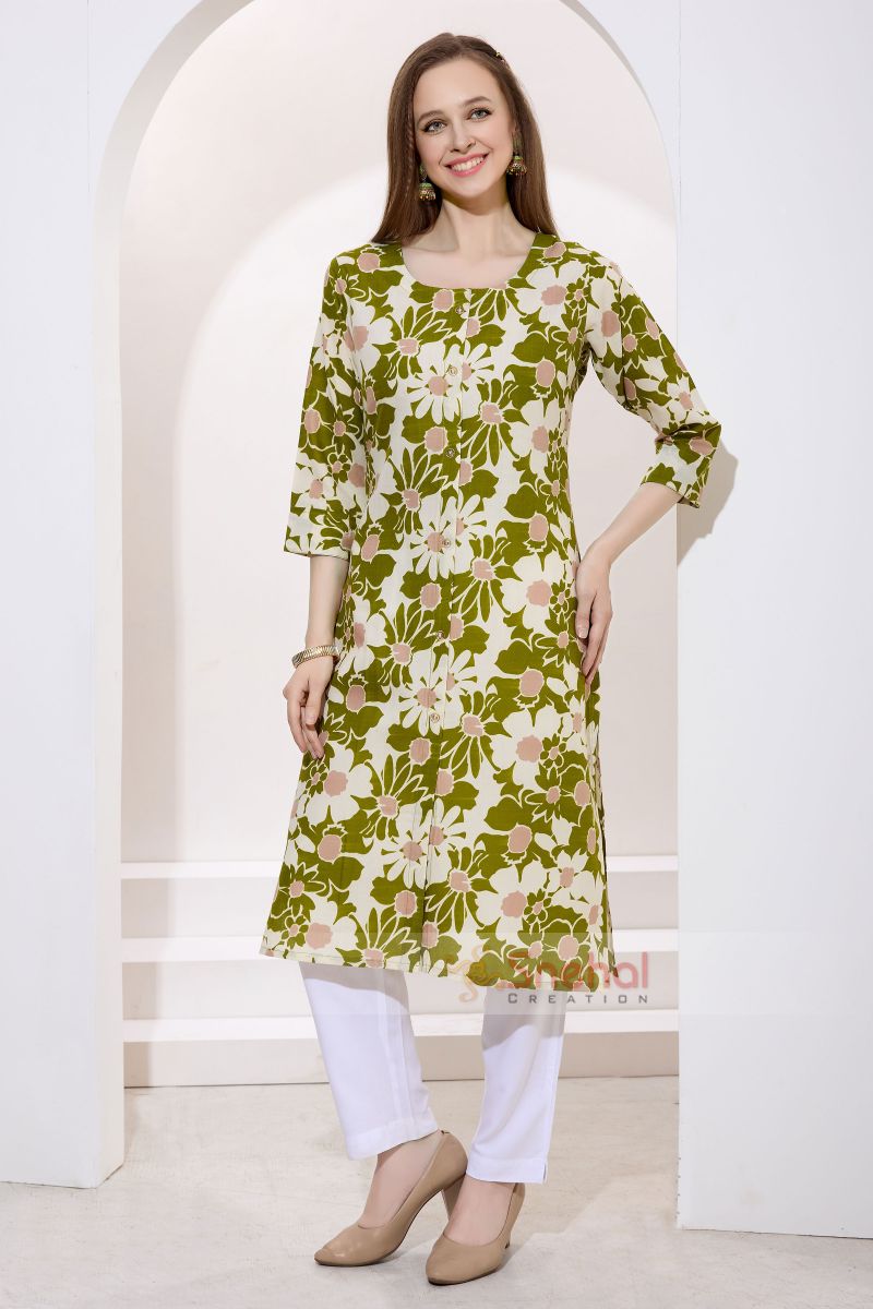 Mehandi Green Linen Cotton Round Neck Women Long Kurta. Embellished with gold buttons.