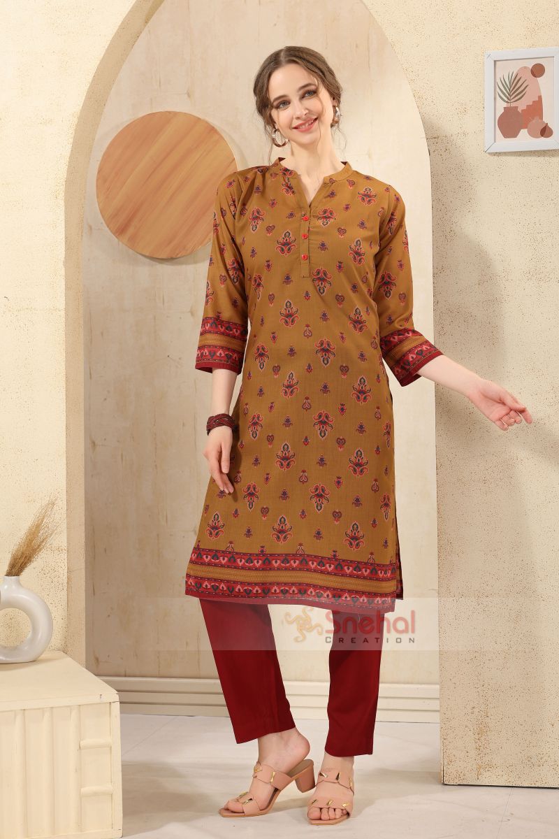 Mustard Cotton Print Ban Collar Long Kurta For Women