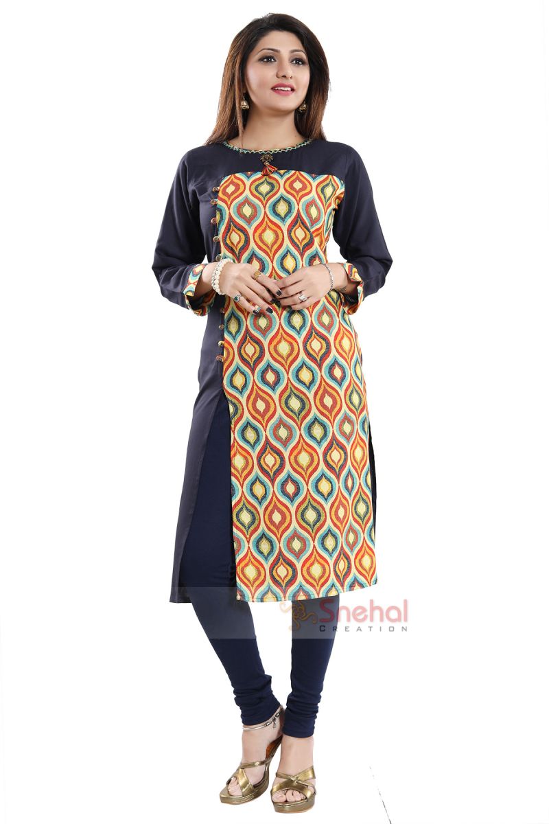 Go all out dressing up in this Navy Blue Designer Rayon Tunic with Vibrant Print Layer from the house of Snehal Creation. This round neck tunic comes with a set of three fourth sleeves. The main body is layered with vibrantly printed fabric and hoop detailing. The neckline has minimalistic thread details with a metal accessory. Sleeves cuffs are made out of printed fabric here.