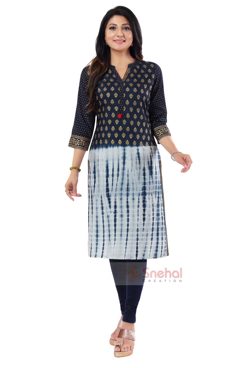 Navy Blue Gold and Shibori Print Designer Long Kurta for Women
